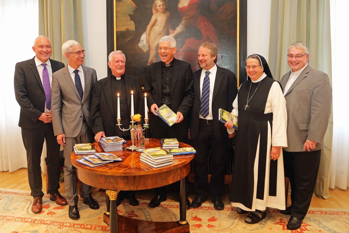 Würzburg (POW) Sein neues Buch „Ich sehe den Himmel offen. Gedanken zu Zeit und Ewigkeit“ hat Bischof Dr. Friedhelm Hofmann am Donnerstag, 14. September, im Bischofshaus vorgestellt. Es enthält ausgewählte Beiträge von Bischof Hofmann aus der Sendereihe „Zeit und Ewigkeit“ des Bayerischen Rundfunks (BR). Anlässlich der 100. Sendung dieser Reihe ist im Würzburger Echter-Verlag zudem das Buch „Schlüsselfragen. Auf der Suche nach Leben in Fülle“ erschienen. Zwei der insgesamt 35 Texte stammen ebenfalls von Bischof Hofmann. Der Bischof dankte den Verantwortlichen des BR dafür, dass diese Sendereihe fest im Programm verankert ist. „Ich bin froh, dass wir eine solche Möglichkeit haben, in die Wohnzimmer der Familien zu kommen und ihnen so christliches Gedankengut näher zu bringen.“