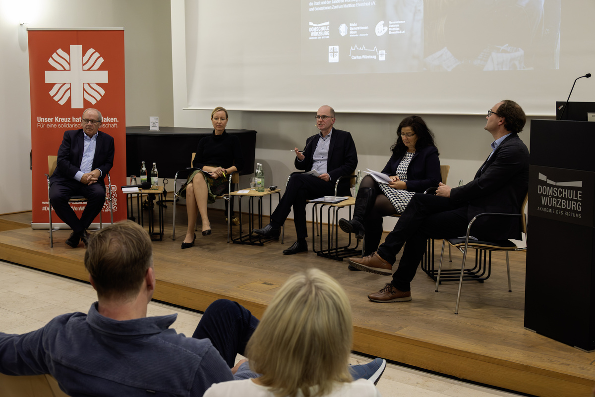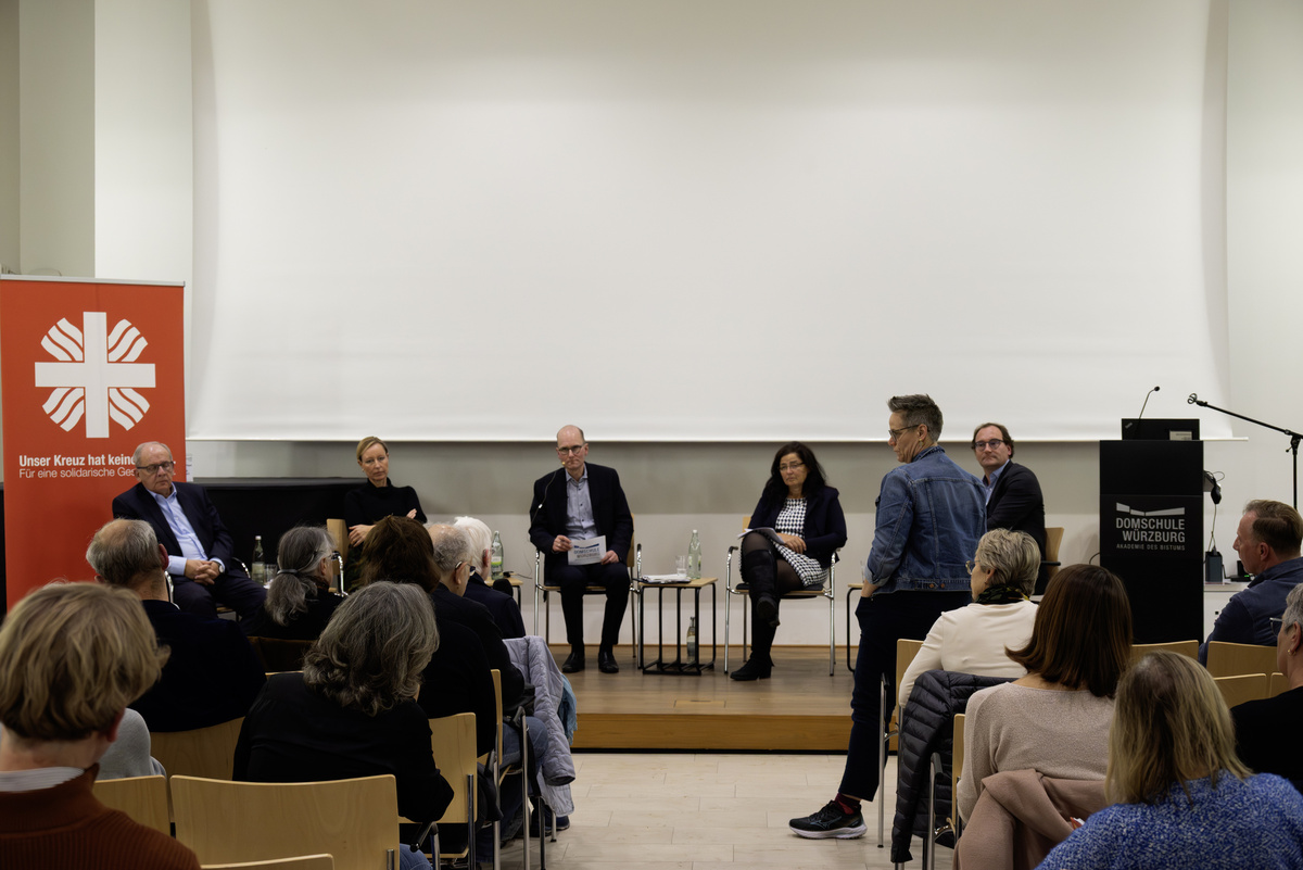 „Wer kann ungerechte Strukturen verändern? Und wer hat den Willen dazu?“ Mit dieser Frage übergab Augustin die Moderation der hochkarätigen Runde an Dr. Stefan Meyer-Ahlen, Studienleiter für Theologie im Fernkurs. Auf dem Podium hatten sich der ehemalige Regierungspräsident Dr. Eugen Ehmann, die neue Sozialreferentin der Stadt Würzburg Eva von Vietinghoff-Scheel, die erste Stellvertreterin des Landrats Christine Haupt-Kreuzer und Kilian Bundschuh, Referent für besondere Lebenslagen der Caritas, eingefunden.