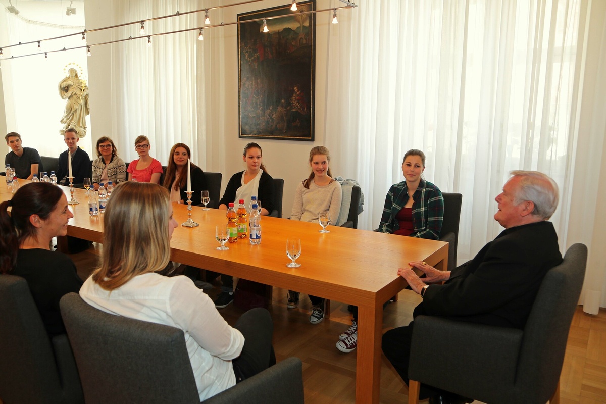 Insgesamt 15 junge Menschen begannen am 1. September 2015 beziehungsweise am 1. September 2014 ihre Ausbildung als Bürokauffrau/-mann für Büromanagement. Für das Treffen hatten sie viele Fragen vorbereitet, die Bischof Hofmann bereitwillig beantwortete. So erzählte er, dass er nach dem Abitur vor der Entscheidung gestanden habe, auf die Kunstakademie zu gehen – und sich doch für das Theologiestudium entschieden habe. „Ich habe es nicht bereut, ich würde heute wieder den gleichen Weg gehen.“ Was er an seiner Arbeit am meisten möge, wollte eine junge Frau wissen. „Den Kontakt mit den Leuten und die Begegnung, vor allem mit Kindern und Jugendlichen“, antwortete Bischof Hofmann. Es sei ein unvergessliches Erlebnis, wenn die Kindergarten- und die Kommunionkinder bei der Kiliani-Wallfahrtswoche in den Dom einziehen. Als Bischof reise er auch sehr viel durch die Welt. Er erzählte von einer Blechhütte mitten in einem afrikanischen Slum, in der er einen begeisternden Gottesdienst erlebt habe. Auch die Meinung des Bischofs zum Zölibat interessierte die jungen Menschen. Das sei ein „sehr umstrittenes Thema“, sagte Bischof Hofmann. Er sehe darin ein Glaubenszeugnis, das, wenn es verstanden wird, sehr große Wirkung habe. „Es ist eine Entscheidung für dieses Abenteuer mit Gott.“ Zum Abschluss des Gesprächs sagte er zu den jungen Menschen: „Wir müssen Nähe zu den Menschen haben, und das wird auch Ihre Aufgabe sein.“ Jeder Auszubildende bekam einen Kirchenführer „Der Kiliansdom zu Würzburg“. Begleitet wurden sie von Stefanie Kremling und Katrin Hammer von den Personalabteilungen des Bischöflichen Ordinariats beziehungsweise des Diözesancaritasverbands.