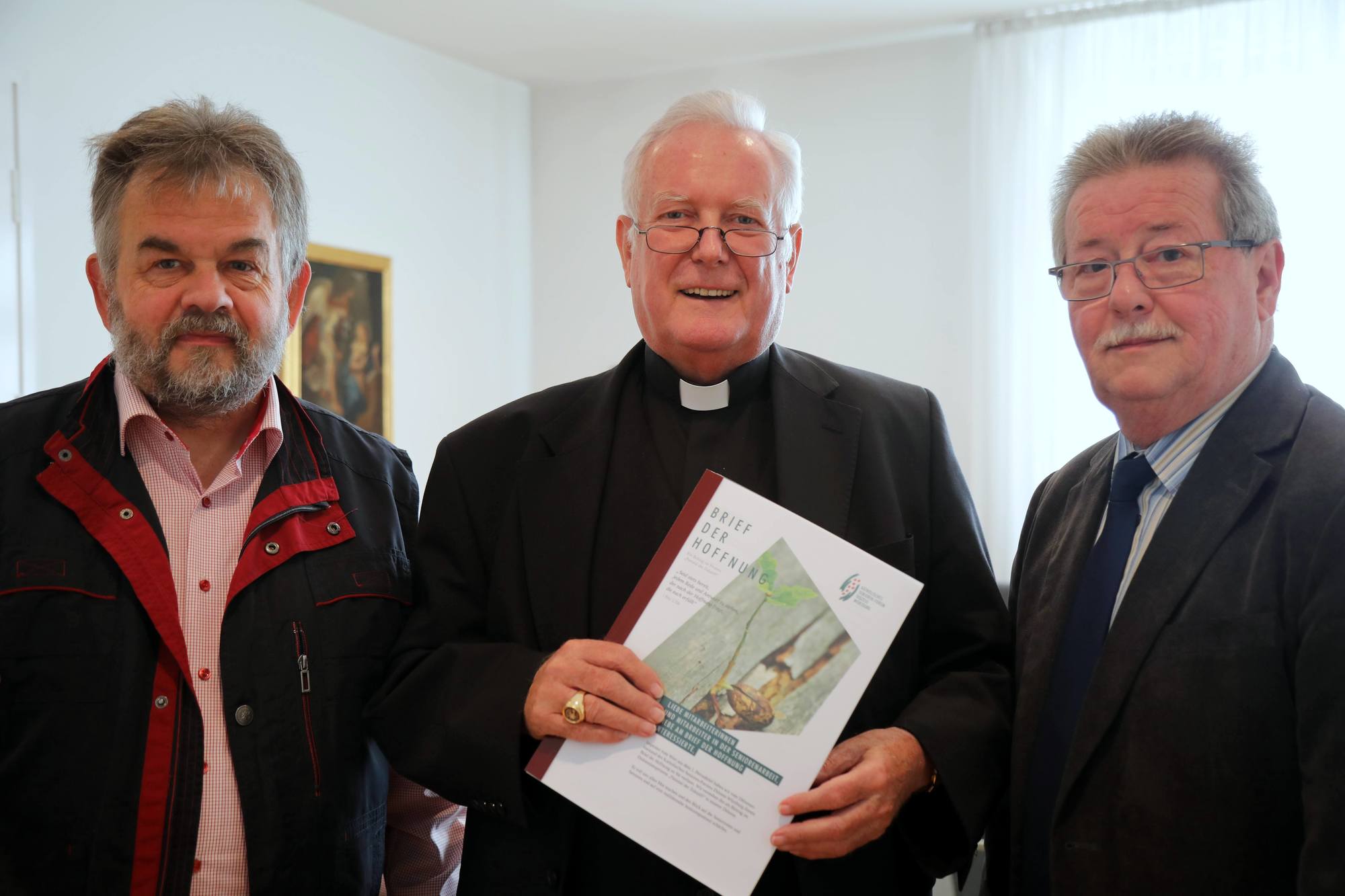 Würzburg (POW) Das erste Exemplar des „Briefs der Hoffnung“ haben Alfred Frank und Volkmar Franz vom Katholischen Senioren-Forum im Bistum Würzburg am Freitag, 15. September, im Bischofshaus an Bischof Dr. Friedhelm Hofmann übergeben. Das Schreiben wird bei den Herbstversammlungen im Oktober an die ehrenamtlichen Mitarbeiterinnen und Mitarbeiter des Senioren-Forums verteilt. „Unseren Brief der Hoffnung verstehen wir als wichtigen Beitrag im Diskussionsprozess über die Pastoral der Zukunft“, sagte Frank, einer der beiden Sprecher des Diözesanvorstandes des Senioren-Forums.