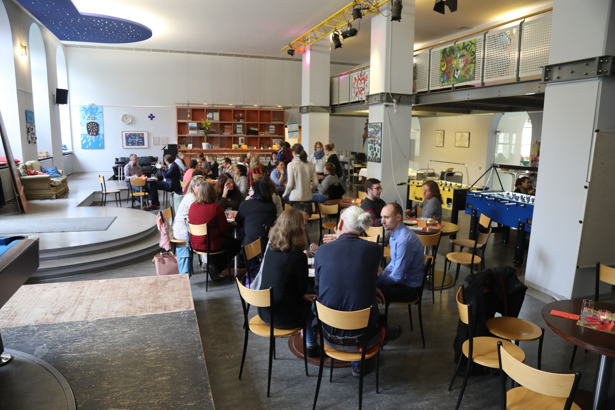 Würzburg (POW) Mittagspause der etwas anderen Art: Das Umweltmanagement-Team des Kilianeums-Haus der Jugend in Würzburg hat am Dienstag, 10. Oktober, zum Mittagessen im Café Dom@in eingeladen. Das Anliegen der Veranstaltung war, mehr Regionales, Saisonales und fair Gehandeltes auf die Speisekarten und heimischen Tische zu bringen. „Wir wollen einen Anstoß geben, bewusster einzukaufen und zu essen“, sagte Wolfgang Zecher. Er setzt sich seit einigen Jahren als Umweltmanagement-Beauftragter des Kilianeums dafür ein, dass die Mitarbeiter des Hauses und darüber hinaus ihren ökologischen Fußabdruck verkleinern. Das Eat-In soll als eine der vielen Maßnahmen Außenwirkung zeigen: „Schon das tägliche Mittagessen ist relevant für die Umweltbilanz.“ Gerade vor dem Hintergrund der derzeitigen Klimasituation sei es wichtig, dass jeder einen kleinen Beitrag leiste, betonte Simon Müller-Pein, Geschäftsführer des Kilianeums. „Die Jugendverbände sind die treibende Kraft in diesem Kontext.“