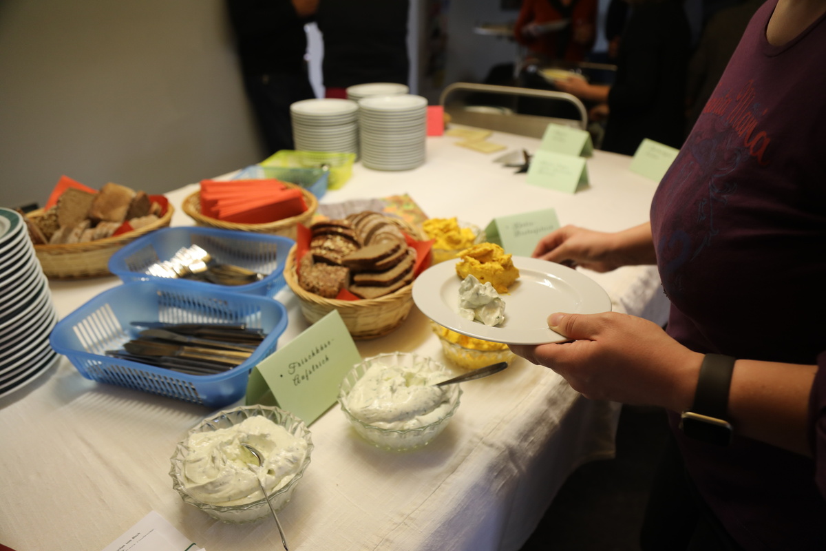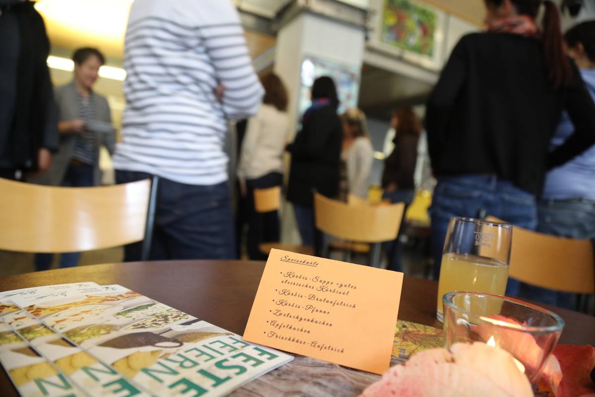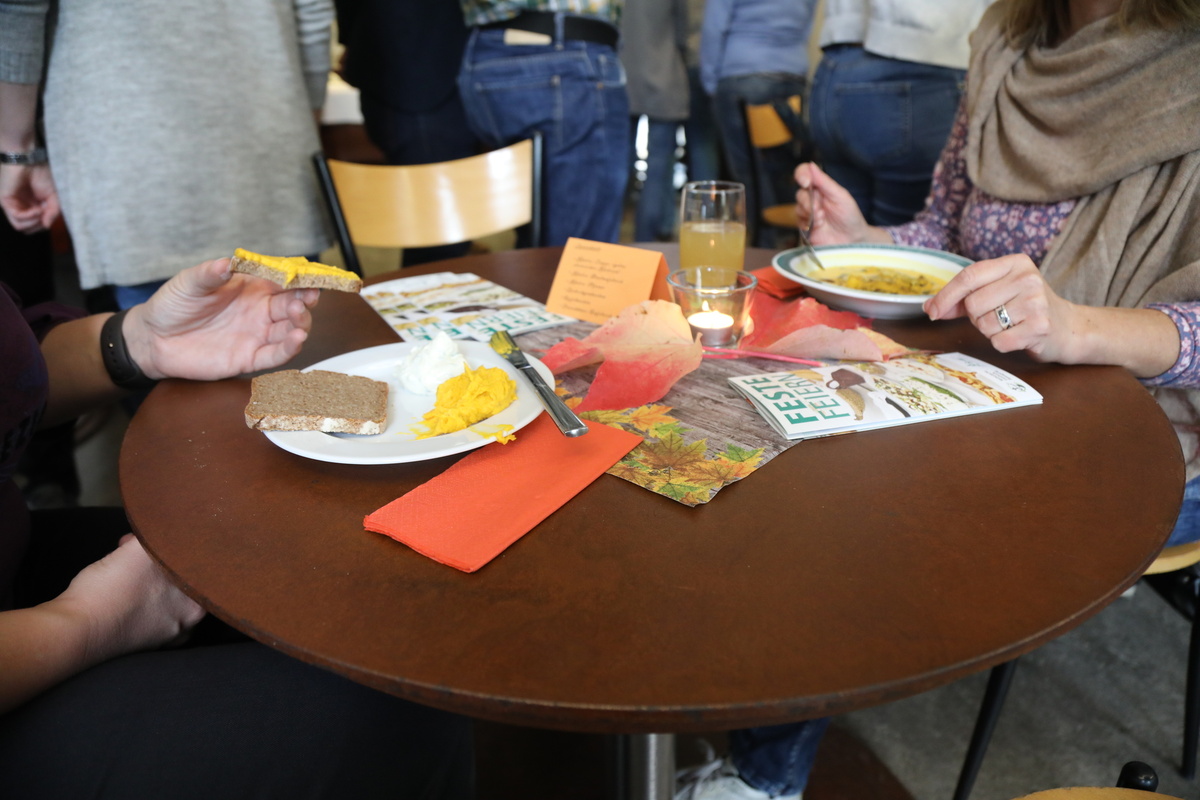 Die Gerichte beim diesjährigen Eat-In orientierten sich an den drei Aspekten regional, saisonal und fair. Auf der Speisekarte stand eine bunte und gesunde Vielfalt aus Kürbisaufstrich, Bio-Brot, Kürbissuppe und Kürbispfanne sowie Apfel- und Zwetschgenkuchen. Zecher erklärte, dass das Kilianeum-Haus der Jugend mit diesen drei Aspekten Anregungen und Inspiration für den eigenen Konsum geben möchte und zeigen will, dass man die Welt dadurch schon im Kleinen „fair-ändern“ könne.