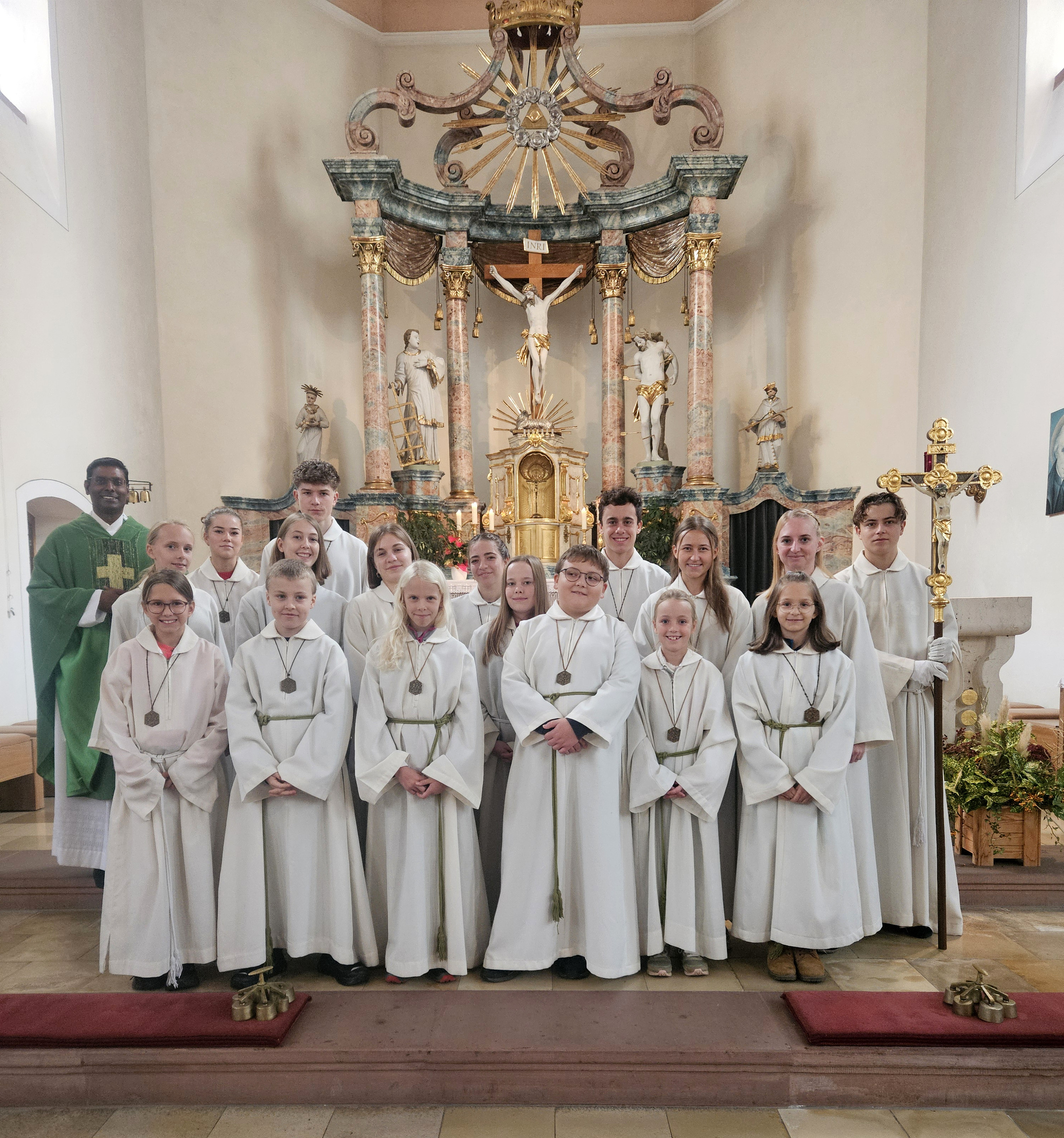 Nachdem Pfarrvikar Napoleon Savariraj die Plakaten gesegnet hat, überreichten die Oberministeranten diese den neuen Minis. Sie sind ein Zeichen der Gemeinschaft und Zusammengehörigkeit.