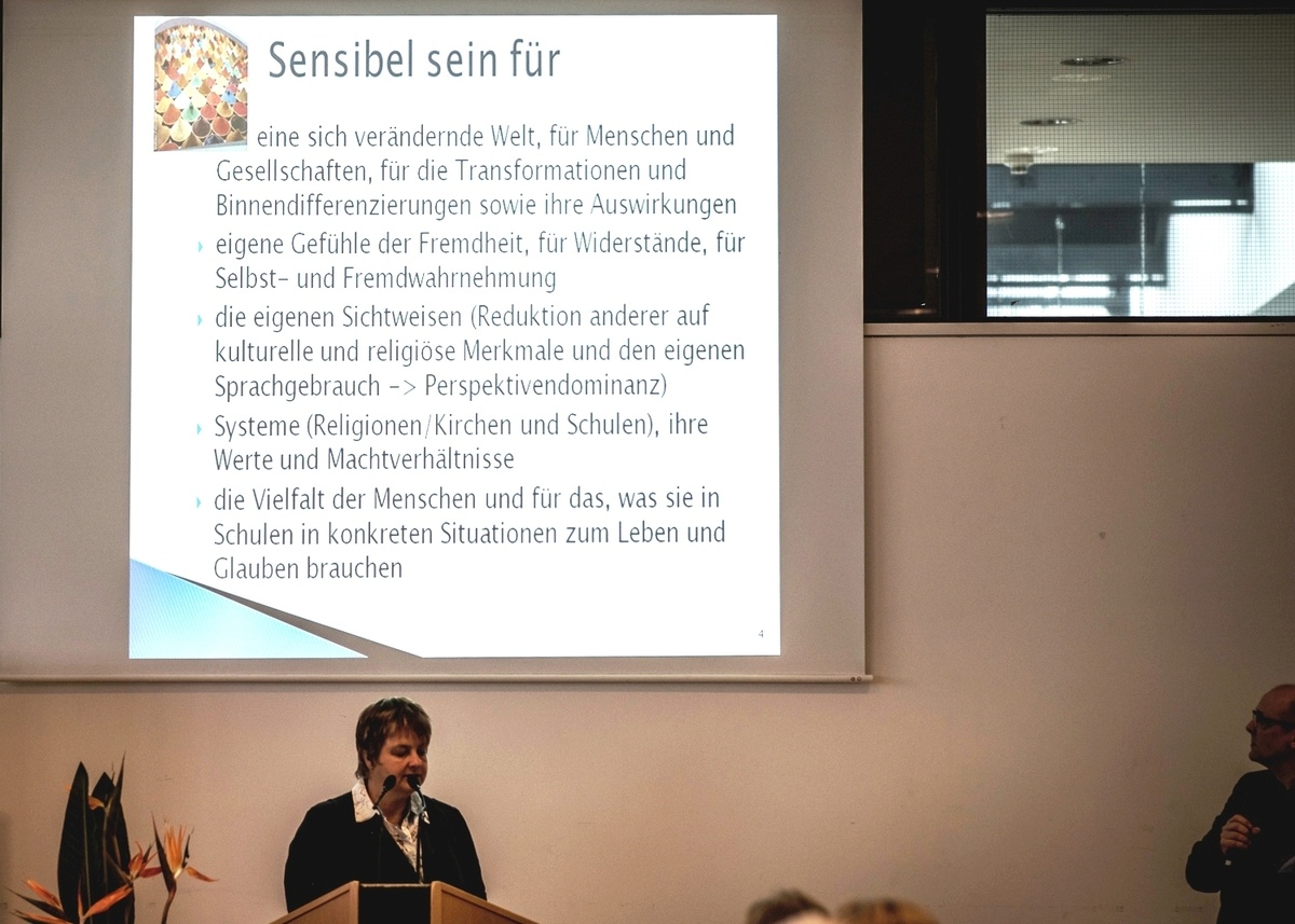 Ebenfalls erfahrungsbezogen gestaltete die Ordinariatsrätin der Diözese Rottenburg-Stuttgart, Ute Augustyniak-Dürr, den Einstieg in den zweiten Tag des Kongresses durch einen Perspektivenwechsel. Sechs Jahre hatte sie mit ihrer Familie an der Grenze zu Israel in Palästina Erfahrungen in einer fremden Kultur gesammelt. Daraus hat die Leiterin der Hauptabteilung Schulen einen „interkulturellen Code“ entwickelt: Für das Gelingen der Begegnungen seien vor allem das gegenseitige Interesse und eine wechselseitige Wertschätzung, Respekt und eine Dankbarkeit von großer Bedeutung. Zu den zentralen Aufgaben der Schulpastoral zählt aus ihrer Perspektive das Bemühen, Menschen auf dem Hintergrund ihrer Lebenswelt zu verstehen und friedensstiftend zu wirken.