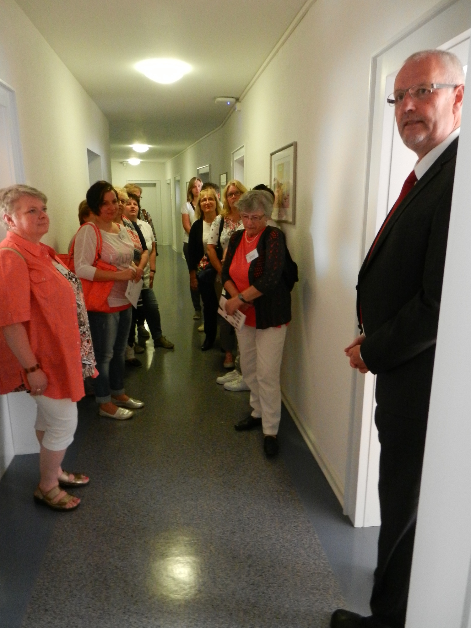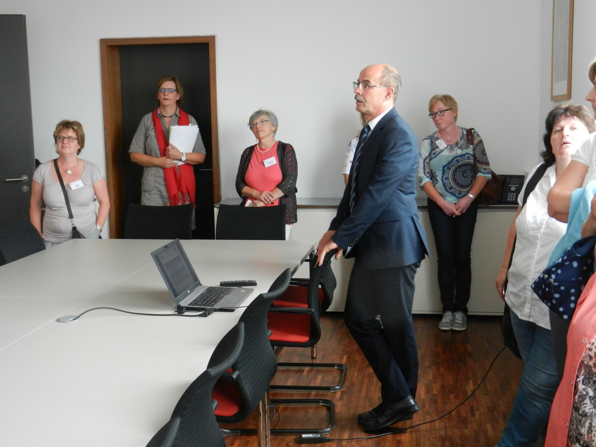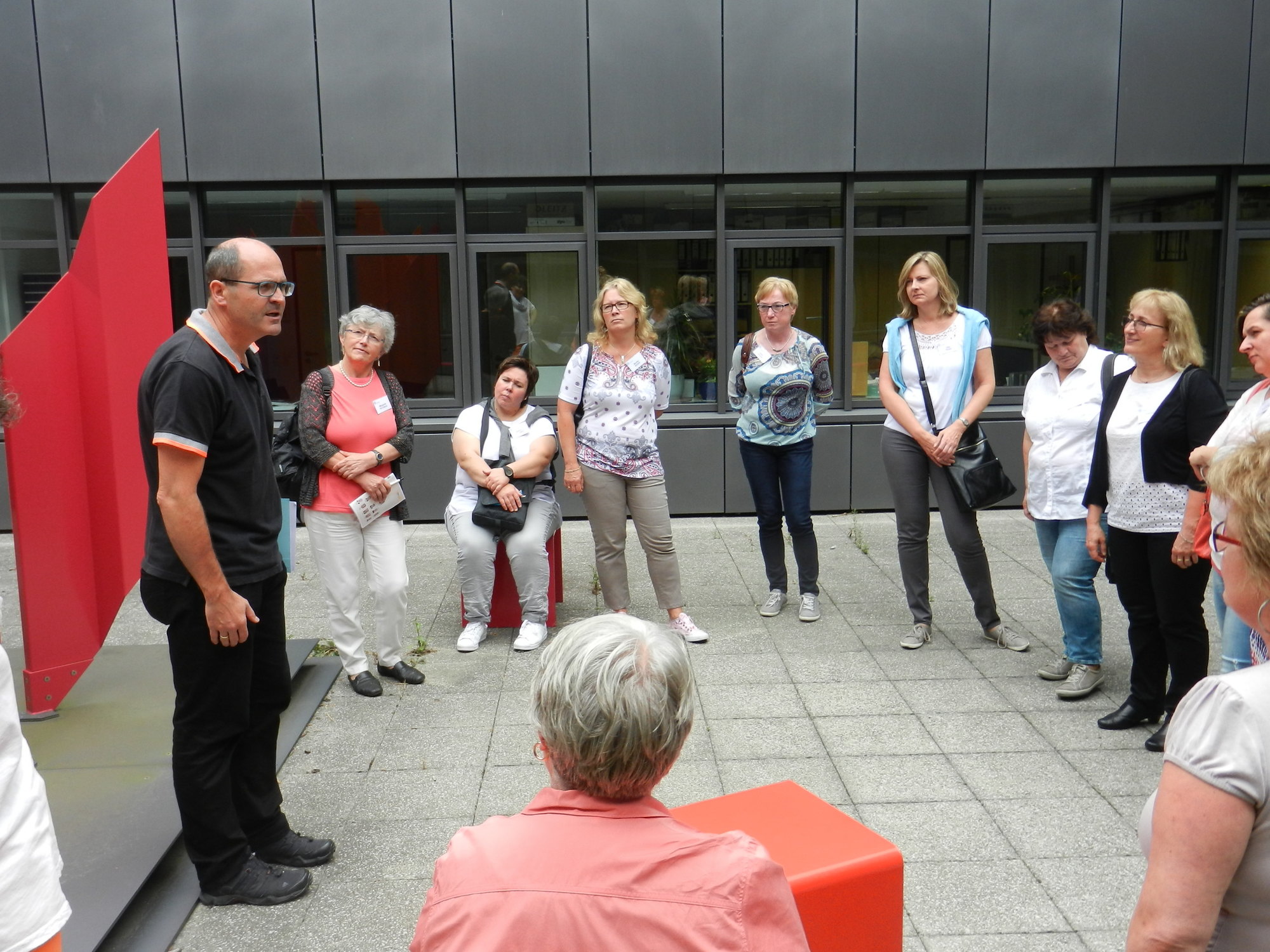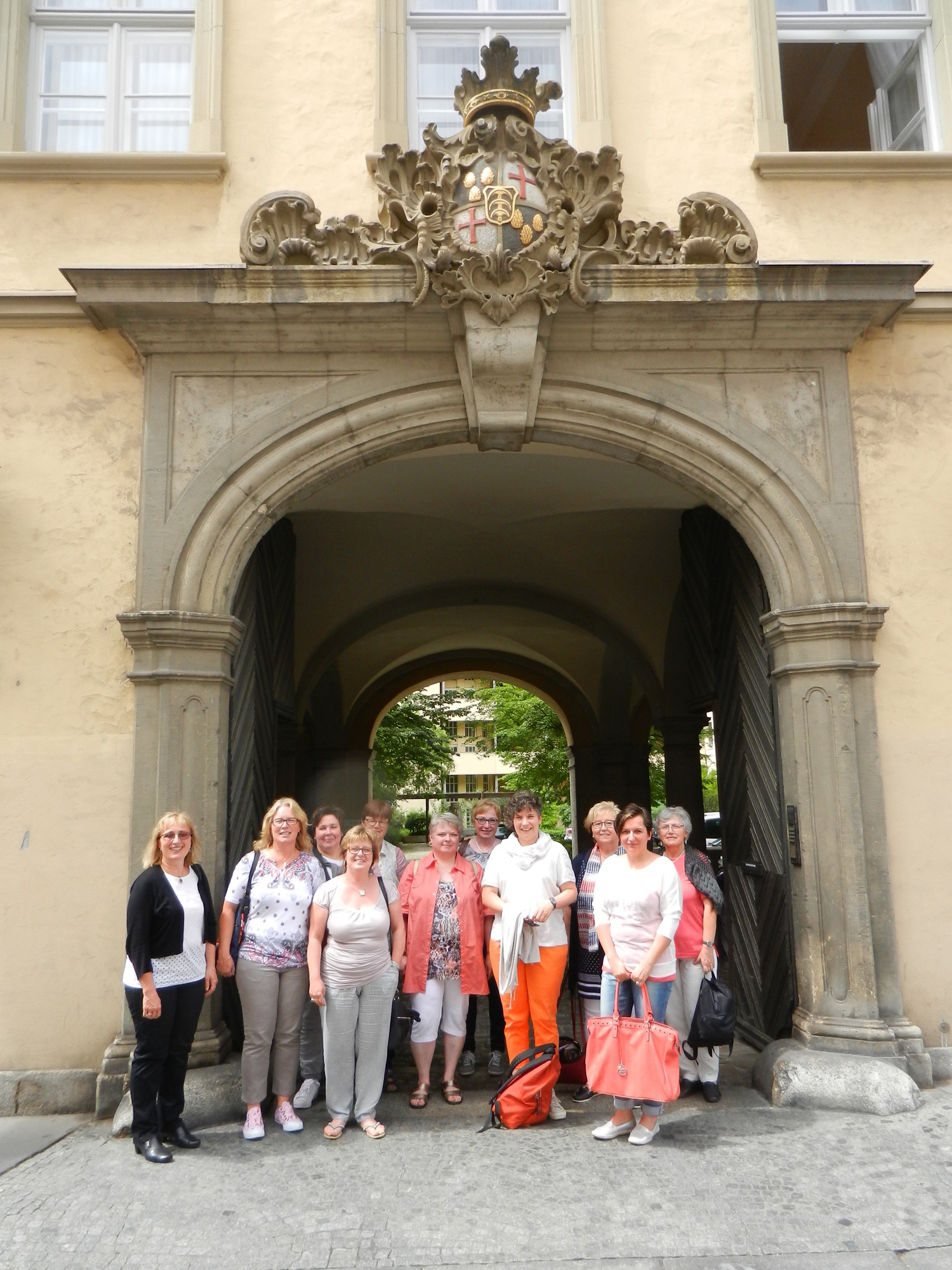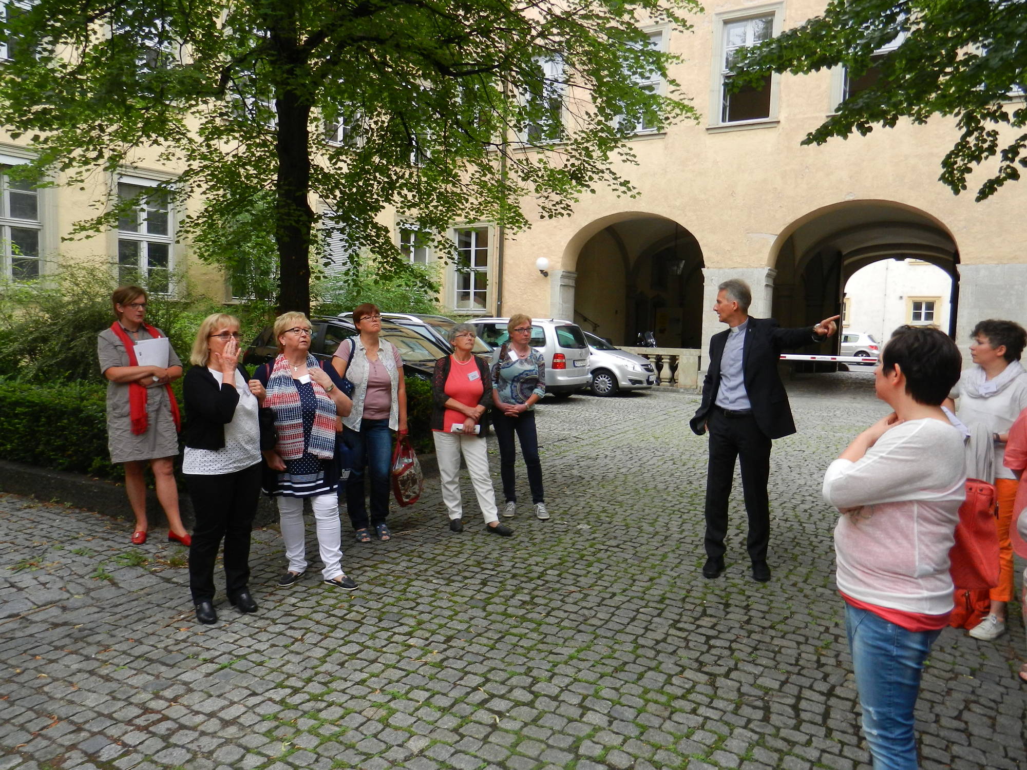 Für 15 Mitarbeiterinnen aus allen Regionen des Bistums öffneten sich in Würzburg die Pforten des Marmelsteiner Hofes, des Medienhauses sowie des Kilianshauses für einen Blick hinter die Kulissen. Dabei bestand die seltene Gelegenheit, zahlreiche Verantwortliche und deren Wirkungsbereich vor Ort kennenzulernen: Dr. Martin Faatz, stellvertretender Leiter der HA I, stellte die komplexe Anlage des Marmelsteiner Hofes und seine Geschichte vor und zeigte anschaulich auf, dass auch „die in Würzburg“ bei der Instandhaltung der Verwaltungsgebäude Abstriche machen müssen. Vom stellvertretenden Finanzdirektor Andreas Hammer bekamen die Teilnehmerinnen einen tieferen Einblick in den Bistumshaushalt, bevor im Medienhaus die Verantwortlichen für Presse und Internet aus dem breiten Angebot des Bereichs Medien berichteten. Die Vielfalt der Referate der Hauptabteilung Seelsorge im Kilianshaus führte schon das eng bedruckte Organigramm des Hauses vor Augen, das Matthias Reichert im sommerlichen Innenhof vorstellte. „Besonders gut gefallen hat mir die Möglichkeit, sich in den Gebäuden umzusehen und direkt von der Mitarbeitern Informationen zu bekommen.“ fasste eine Teilnehmerin ihre Rückmeldung zusammen und eine andere ergänzte „Ich kann nun direkt den persönlichen Kontakt nutzen, wenn Fragen anstehen.“