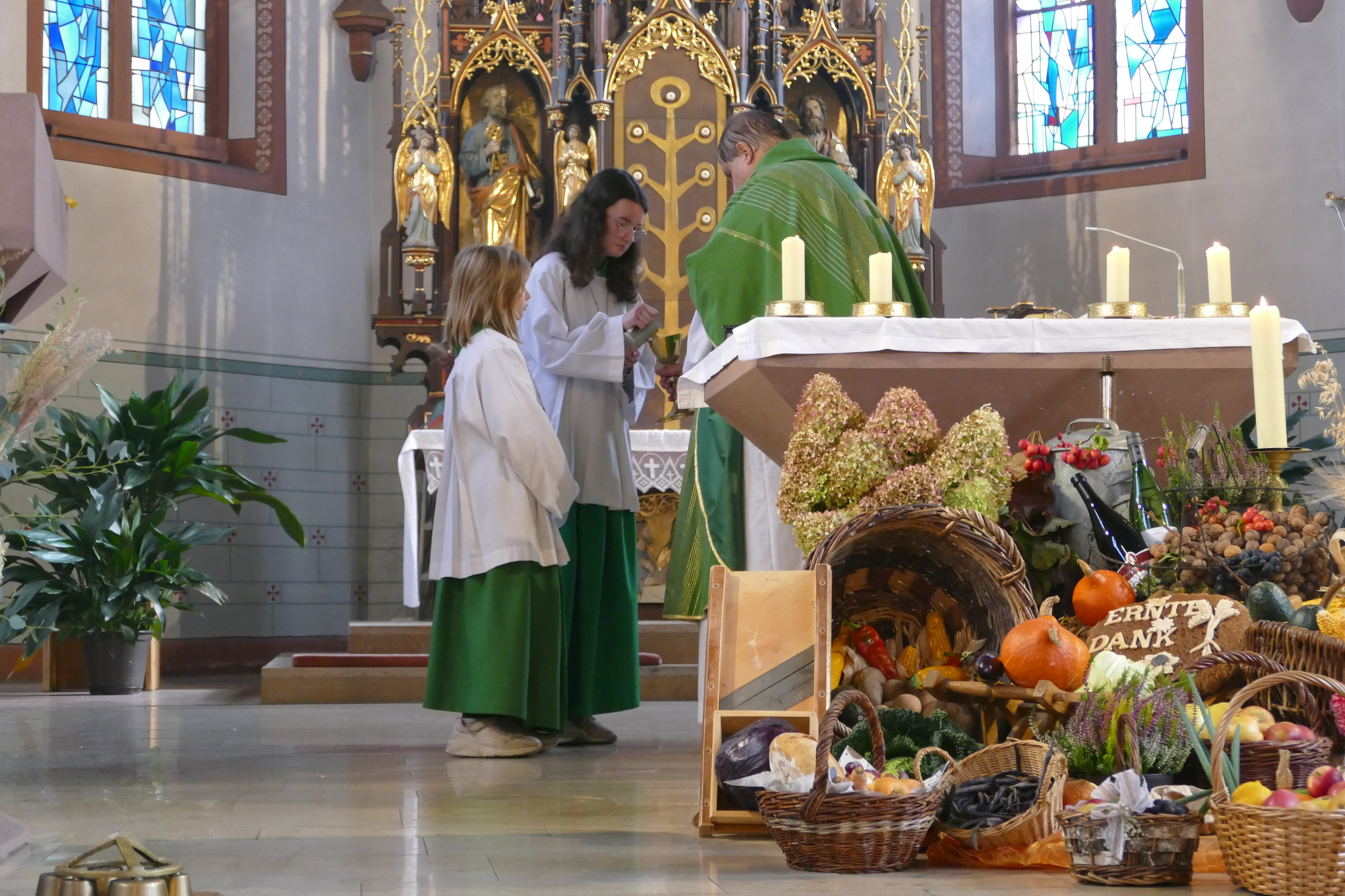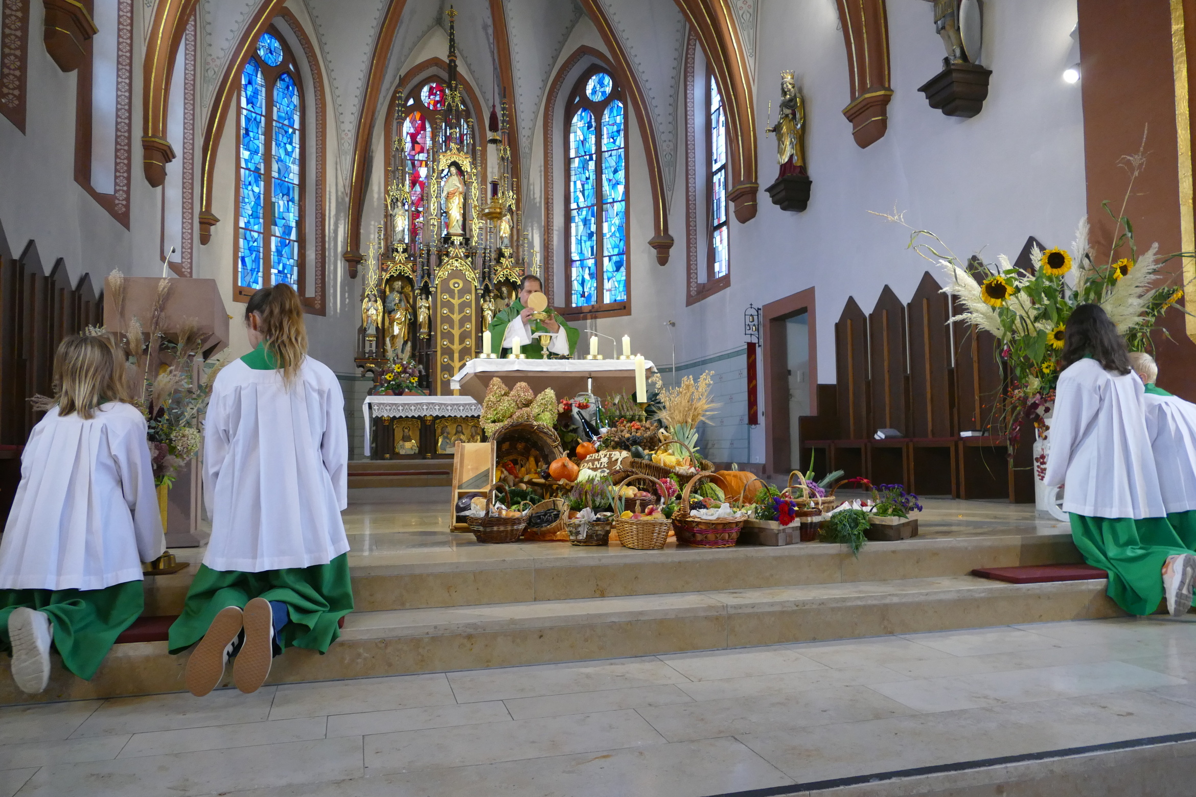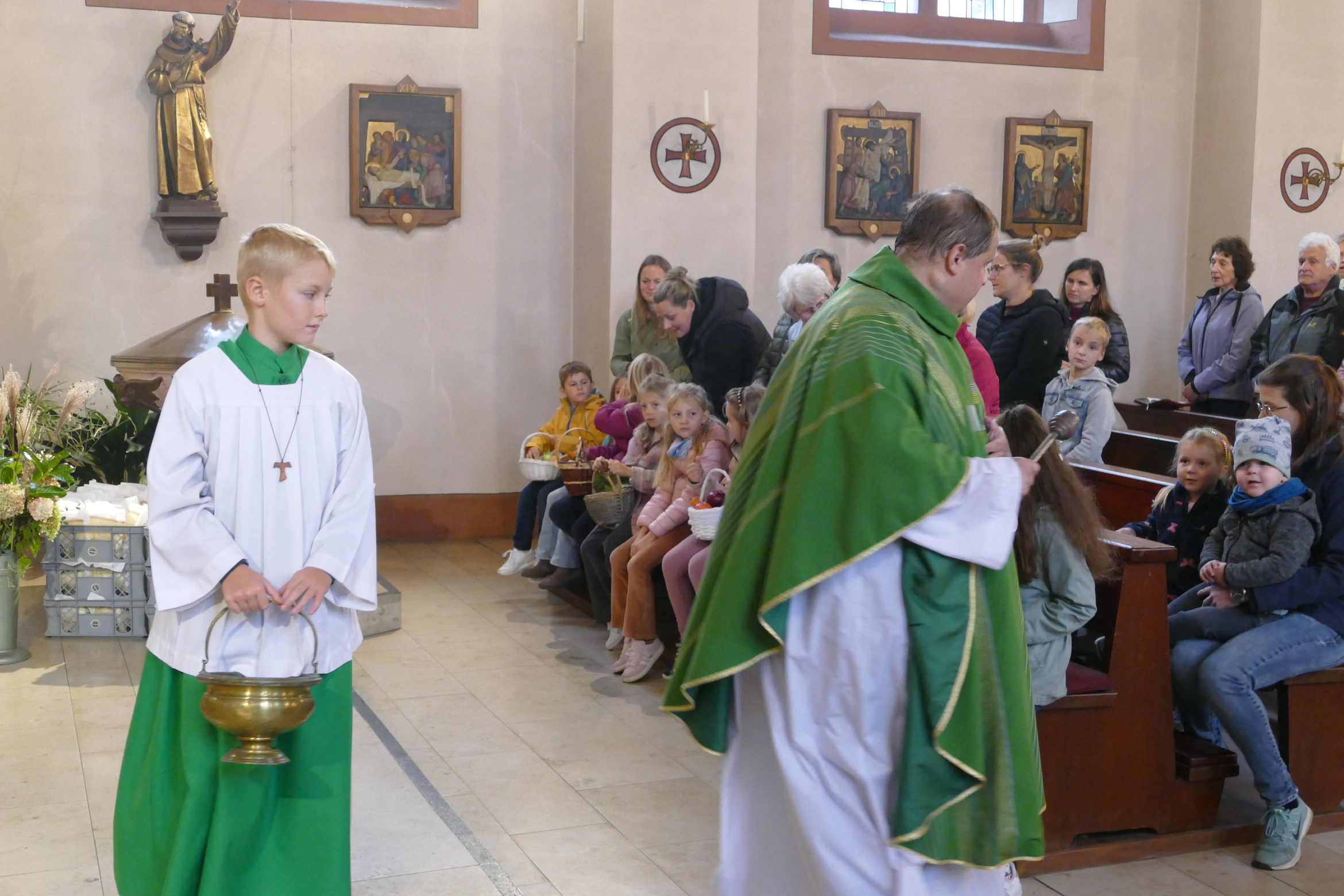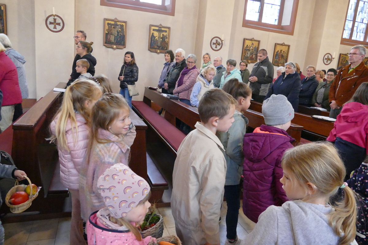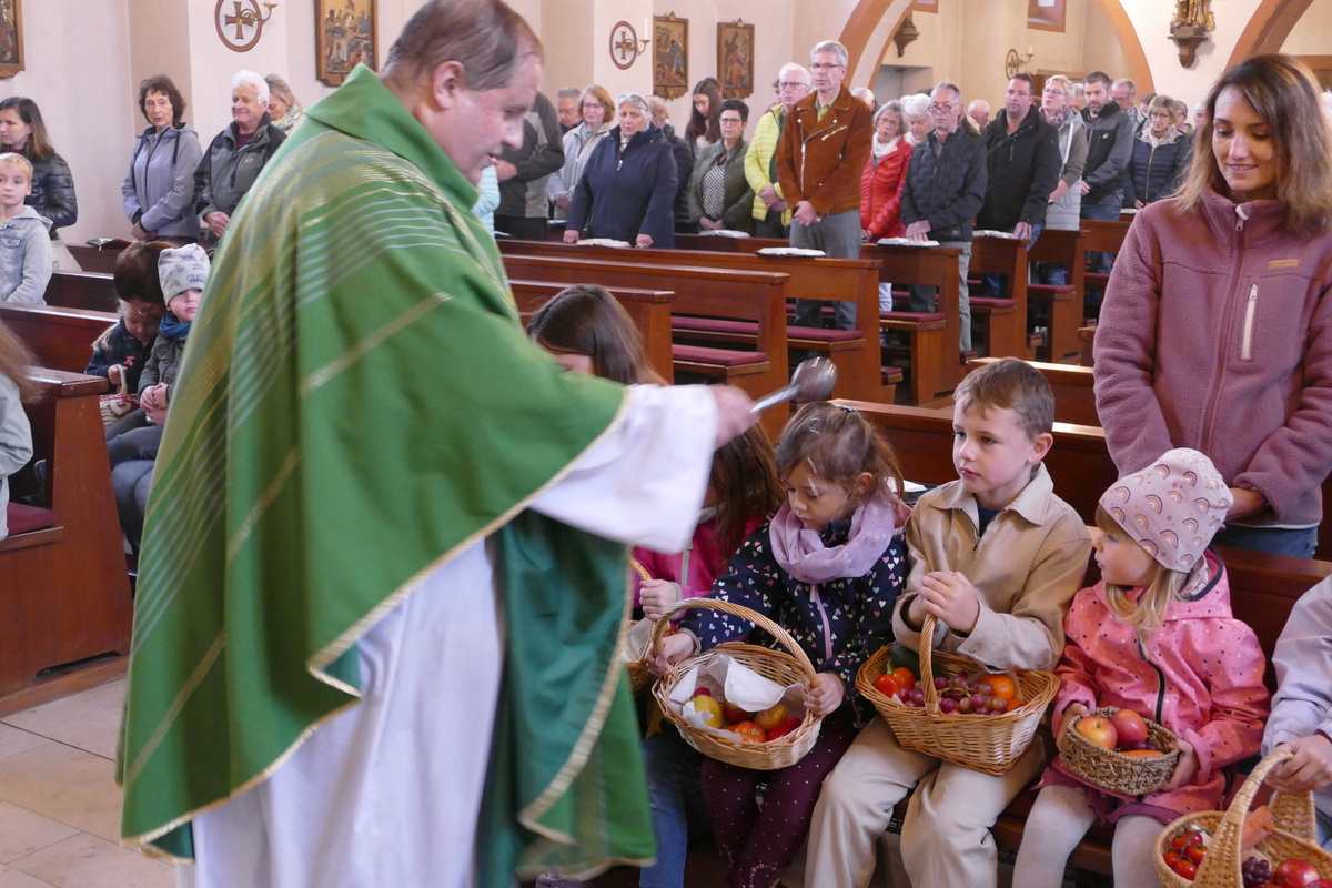 Am Erntedanksonntag zog eine große Schar von Kindern mit ihren Erntekörbchen mit den Ministranten und mit Pfarrer Christian Wöber in die geschmückte Pfarrkirche ein.