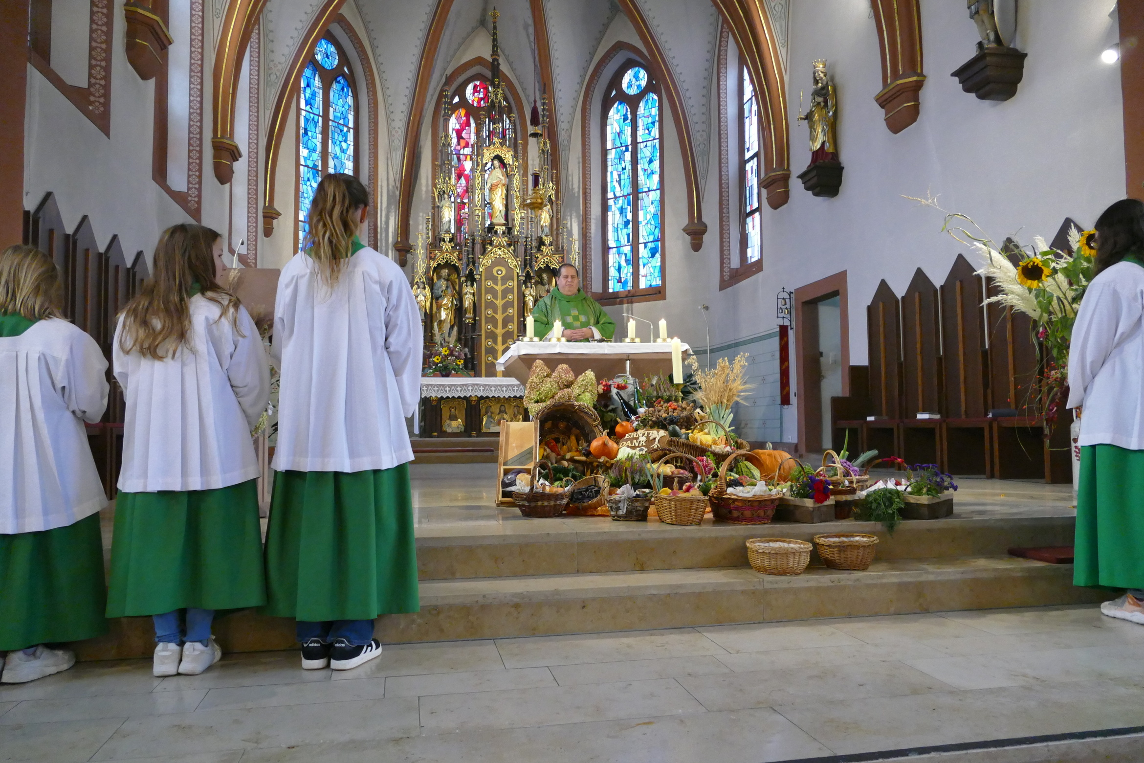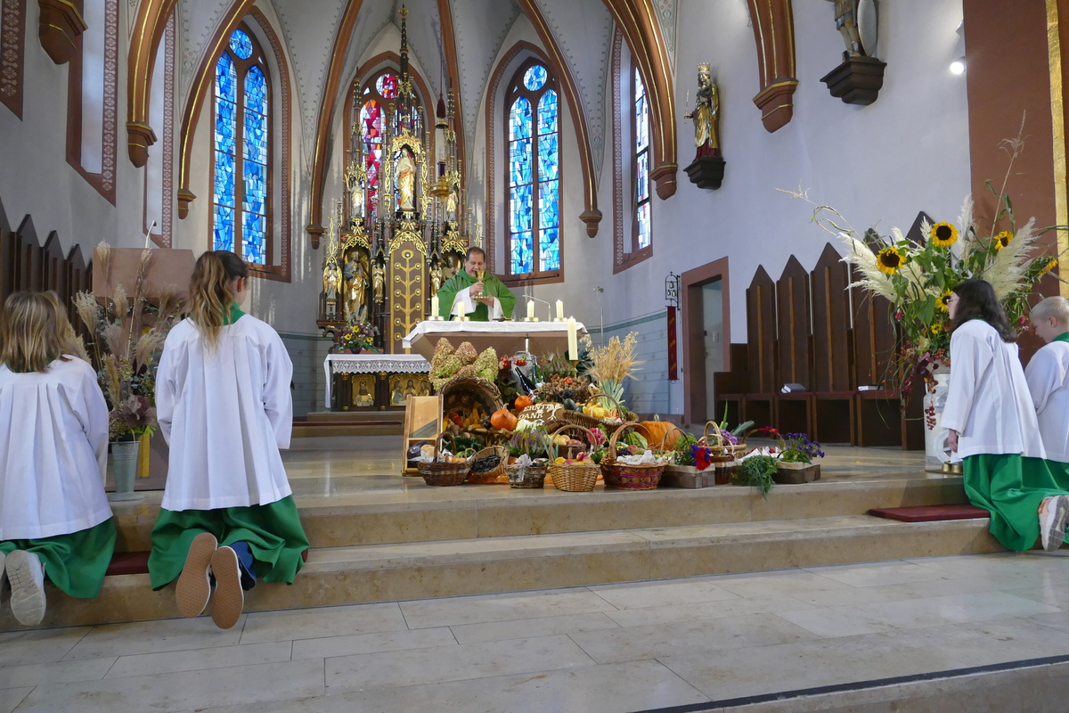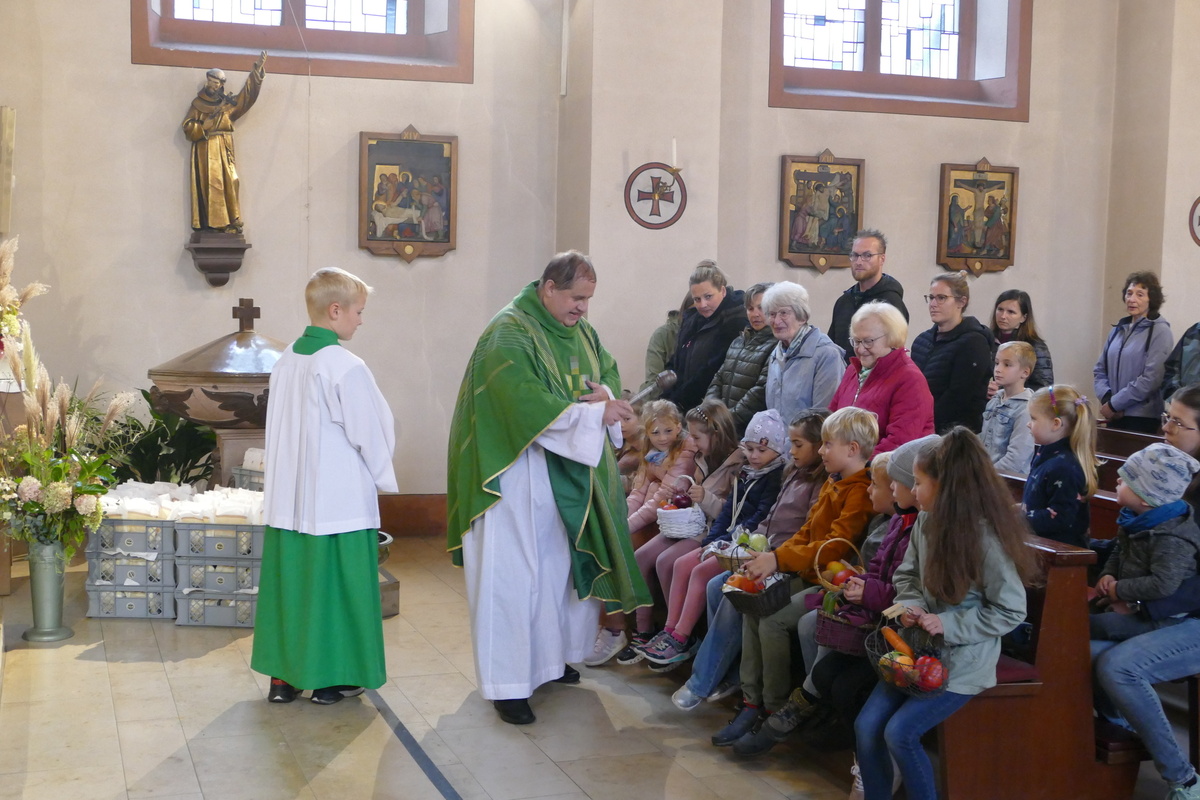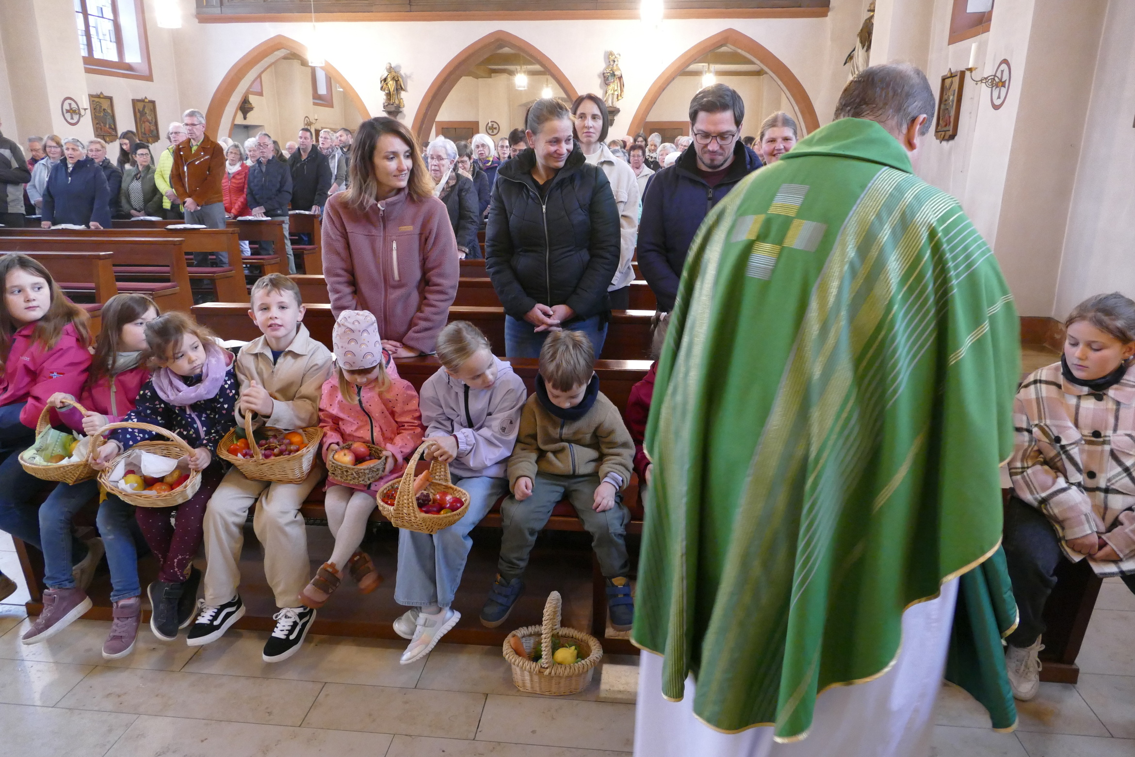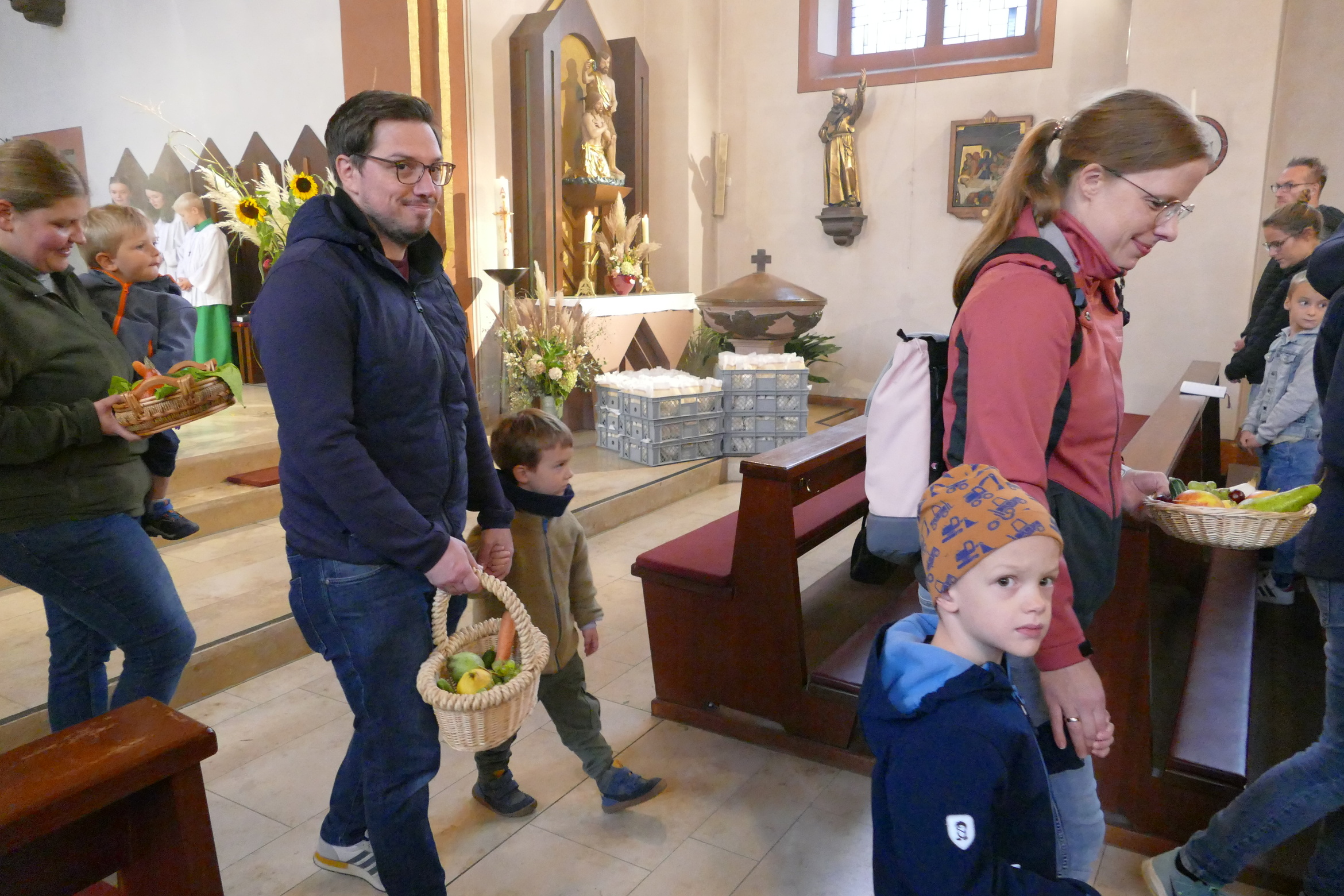 Am Erntedanksonntag zog eine große Schar von Kindern mit ihren Erntekörbchen mit den Ministranten und mit Pfarrer Christian Wöber in die geschmückte Pfarrkirche ein.