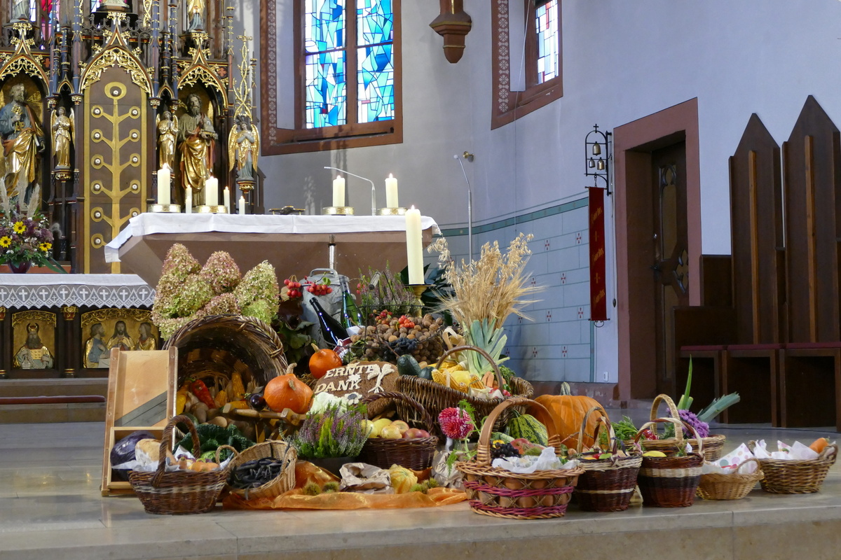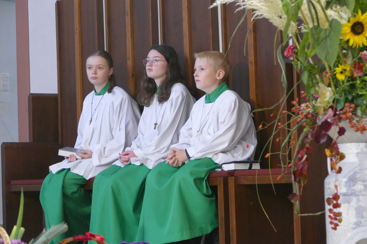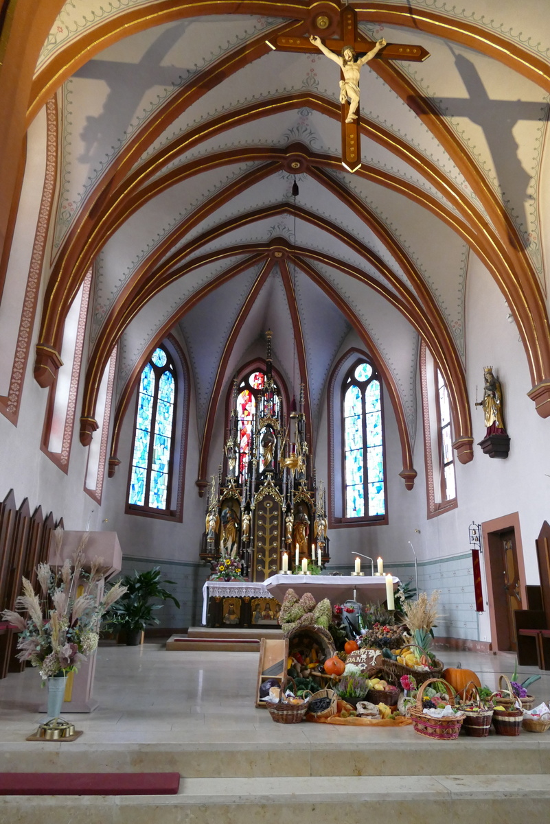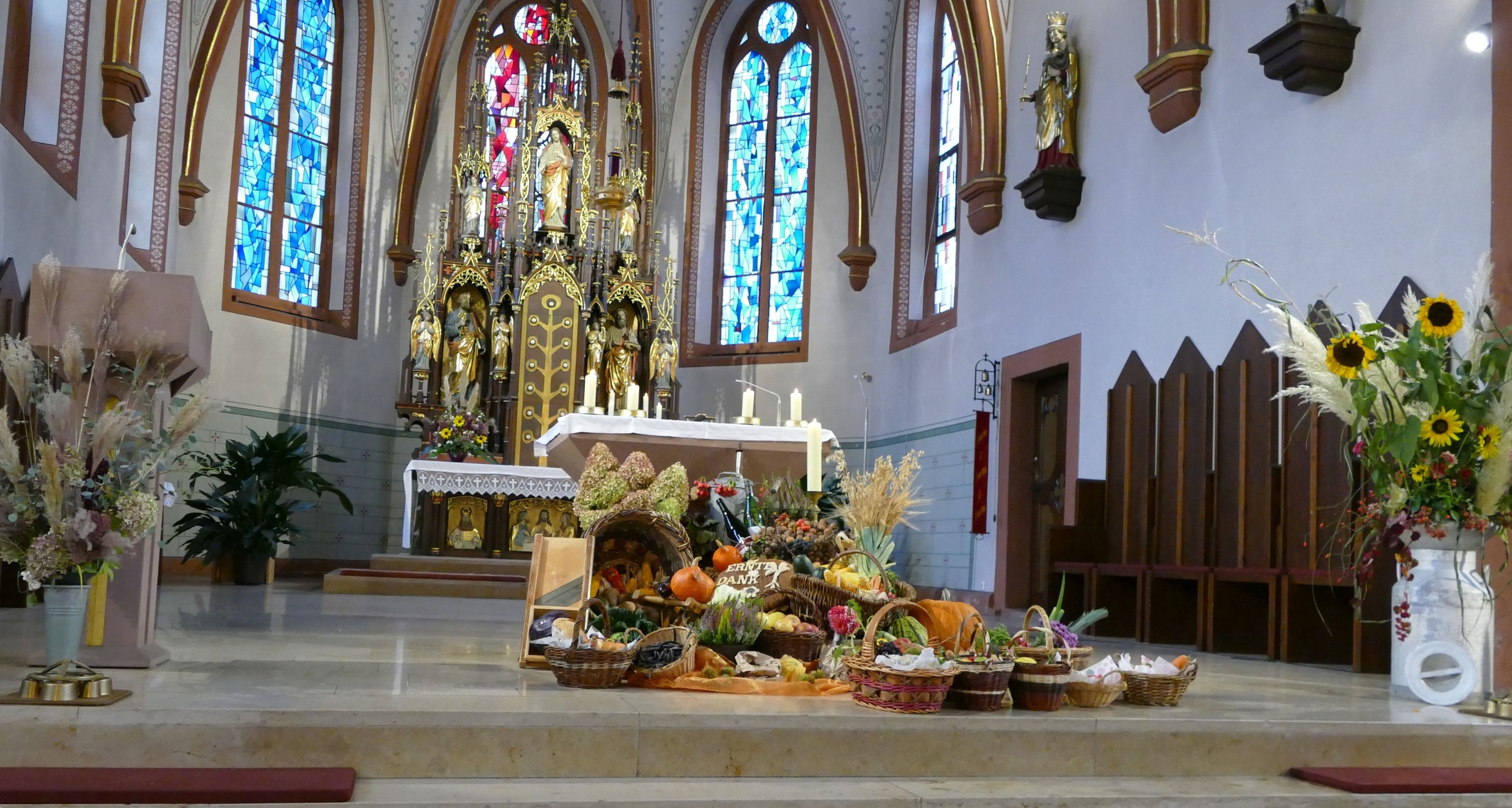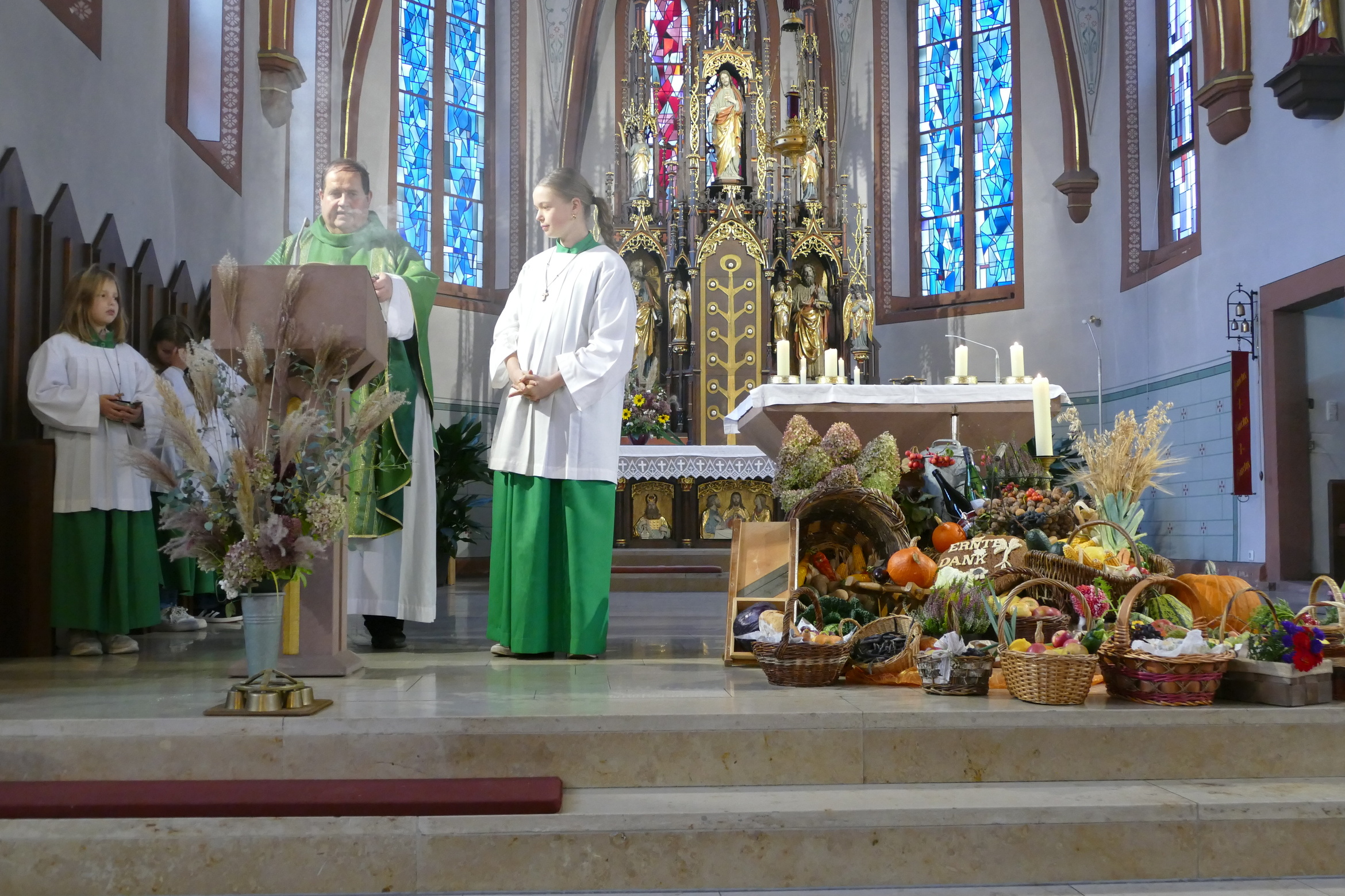 Am Erntedanksonntag zog eine große Schar von Kindern mit ihren Erntekörbchen mit den Ministranten und mit Pfarrer Christian Wöber in die geschmückte Pfarrkirche ein.