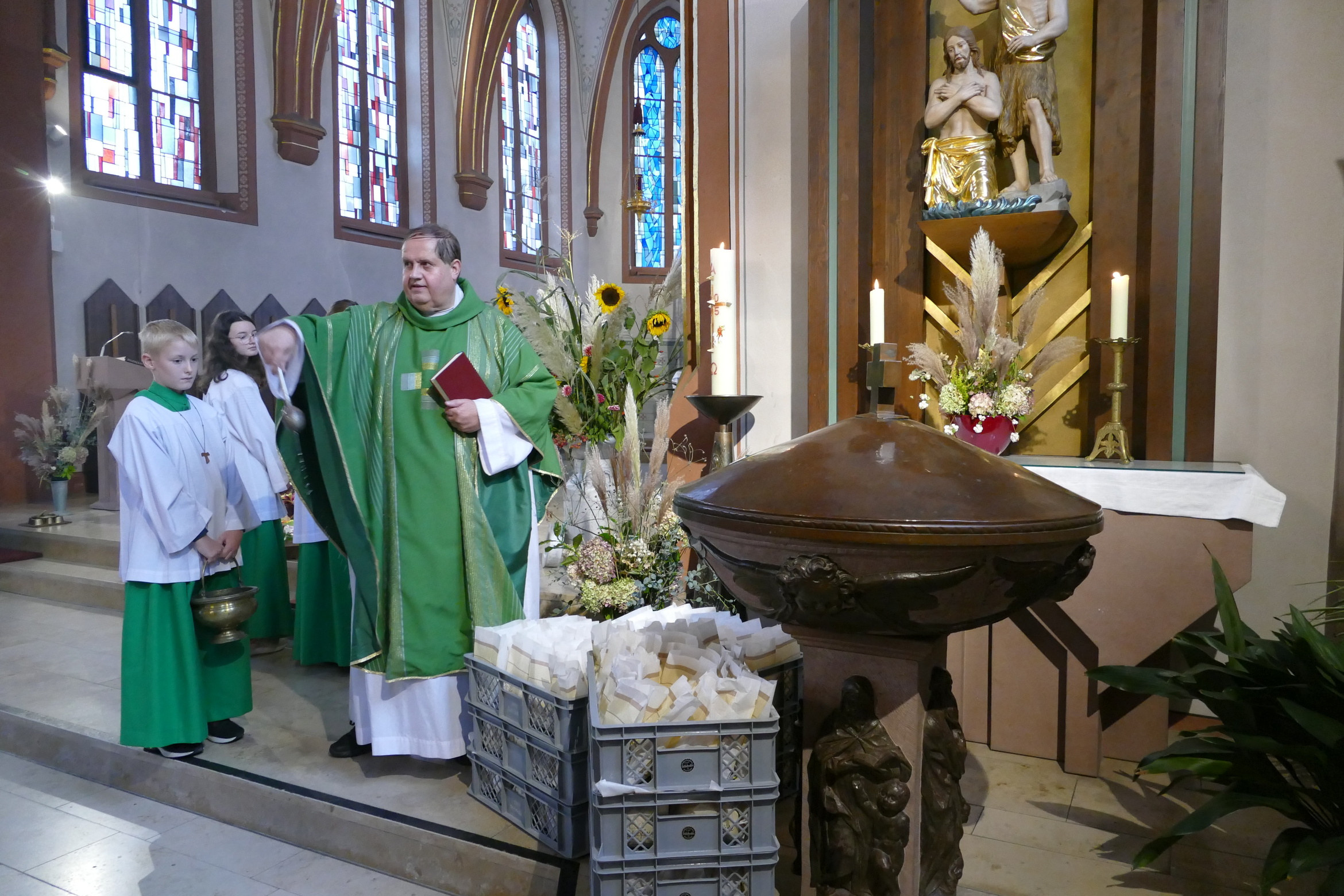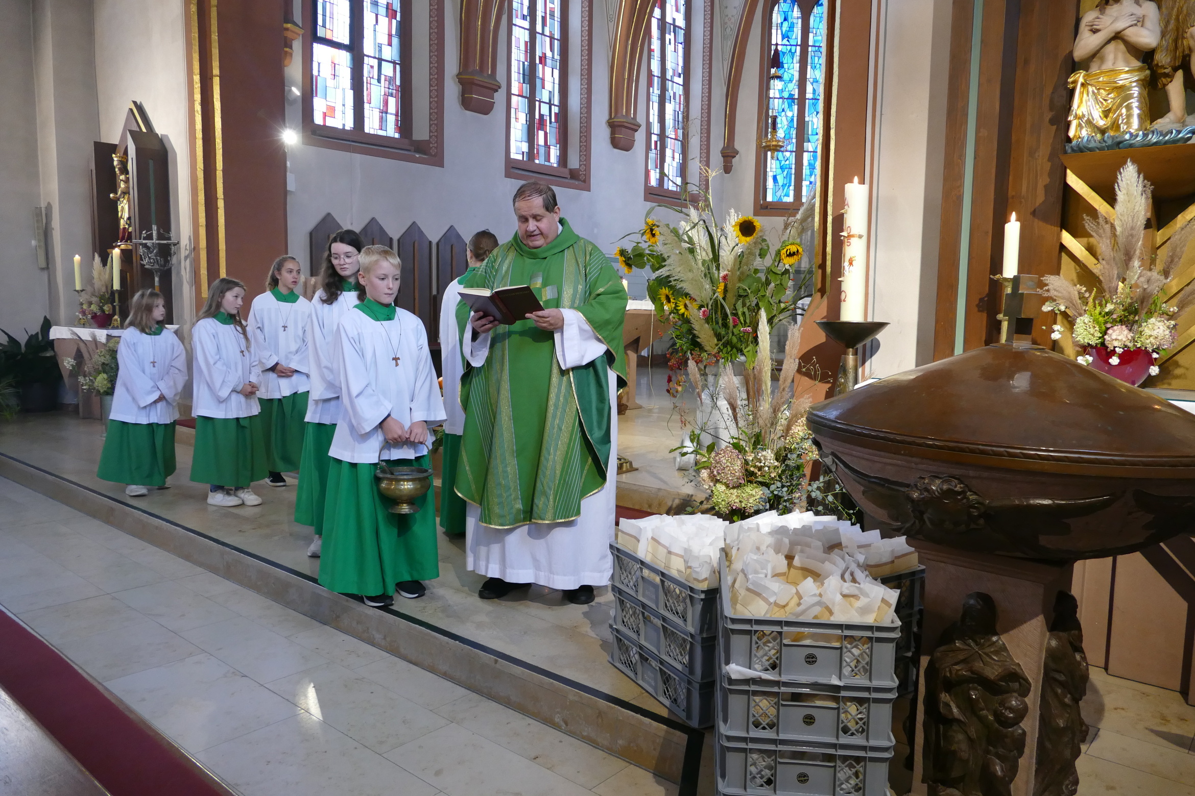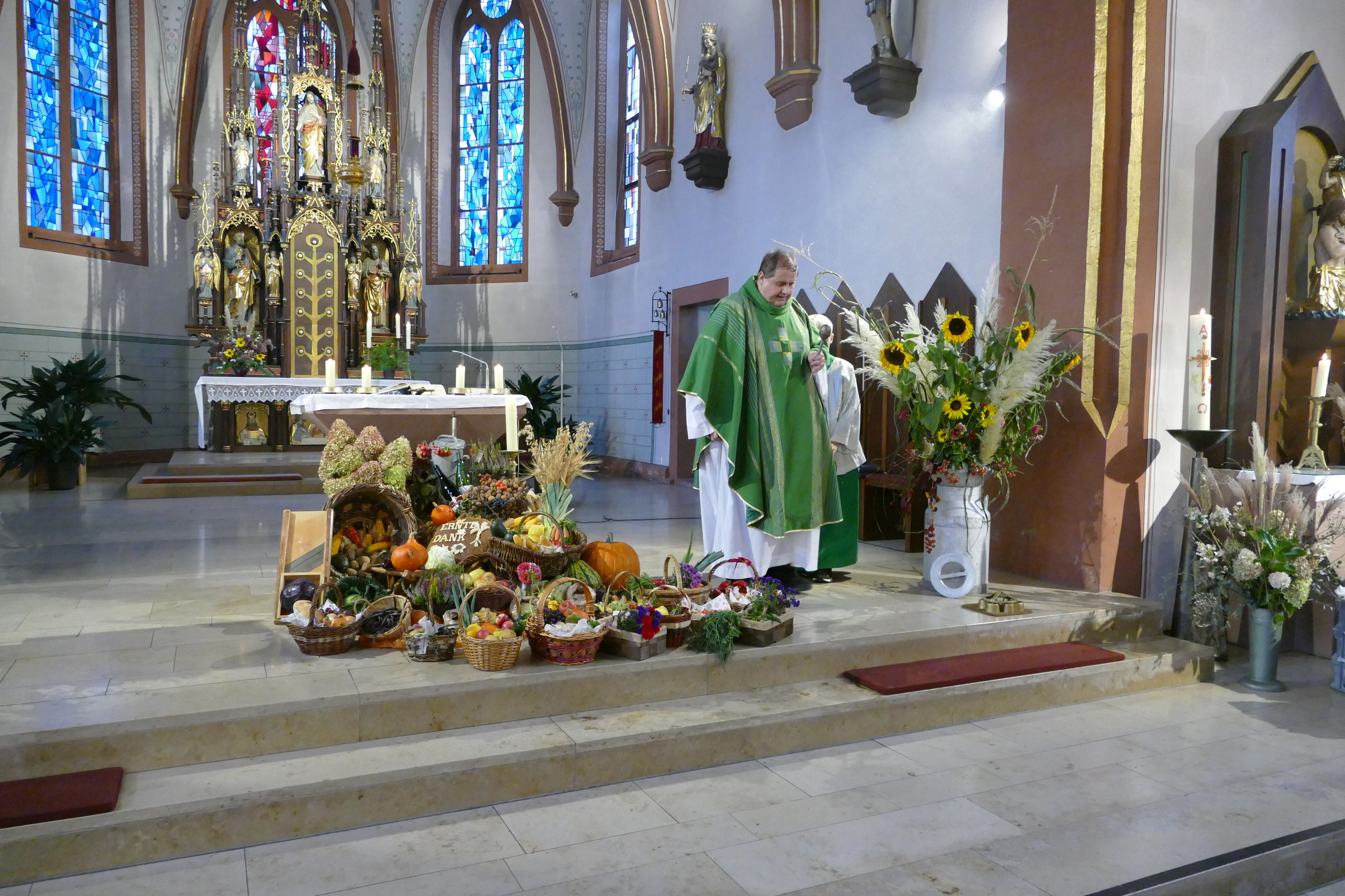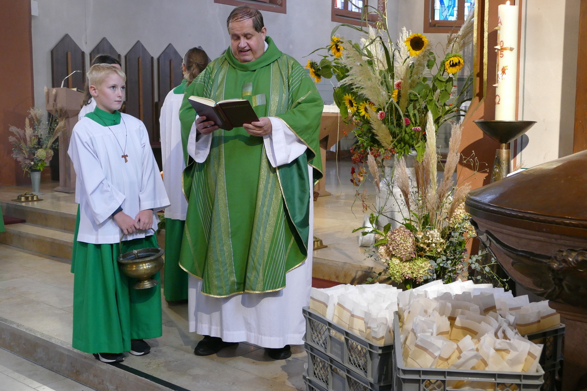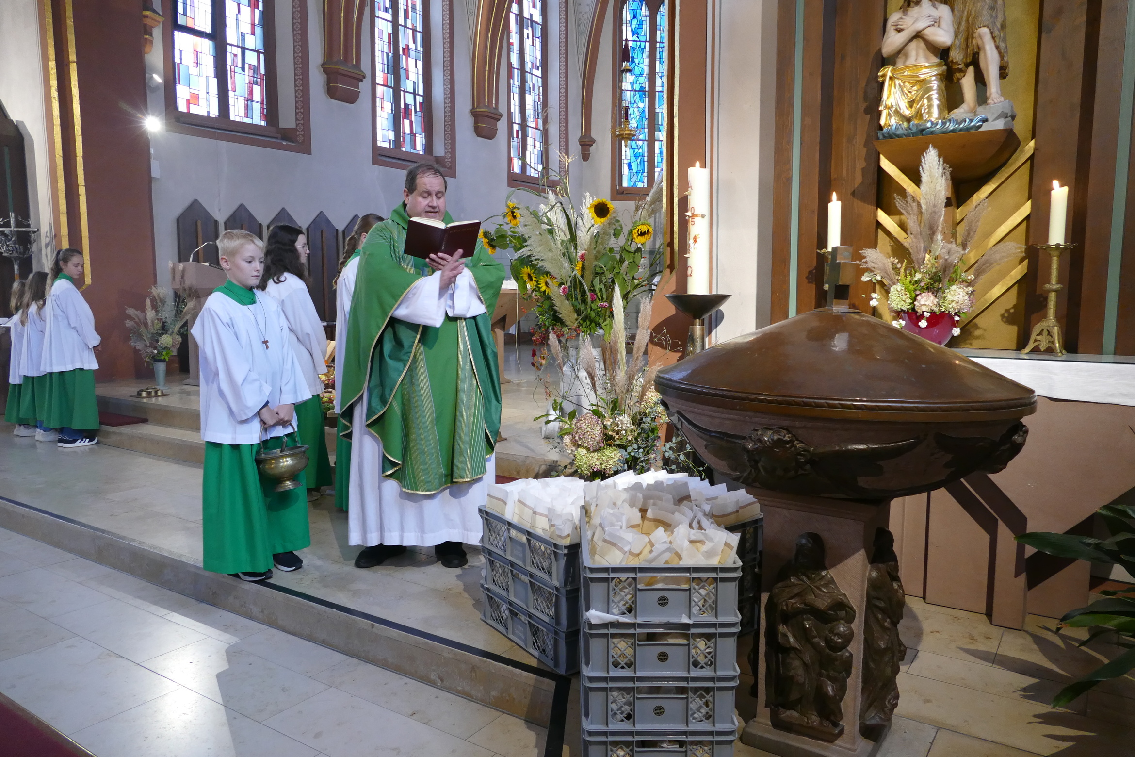 Zu Beginn des Gottesdienstes segnete Pfarrer Wöber den prächtigen Erntedankaltar und die mitgebrachten Erntegaben.