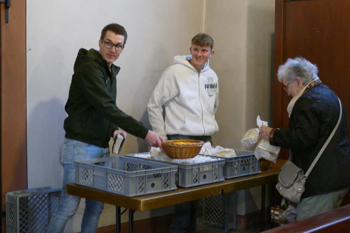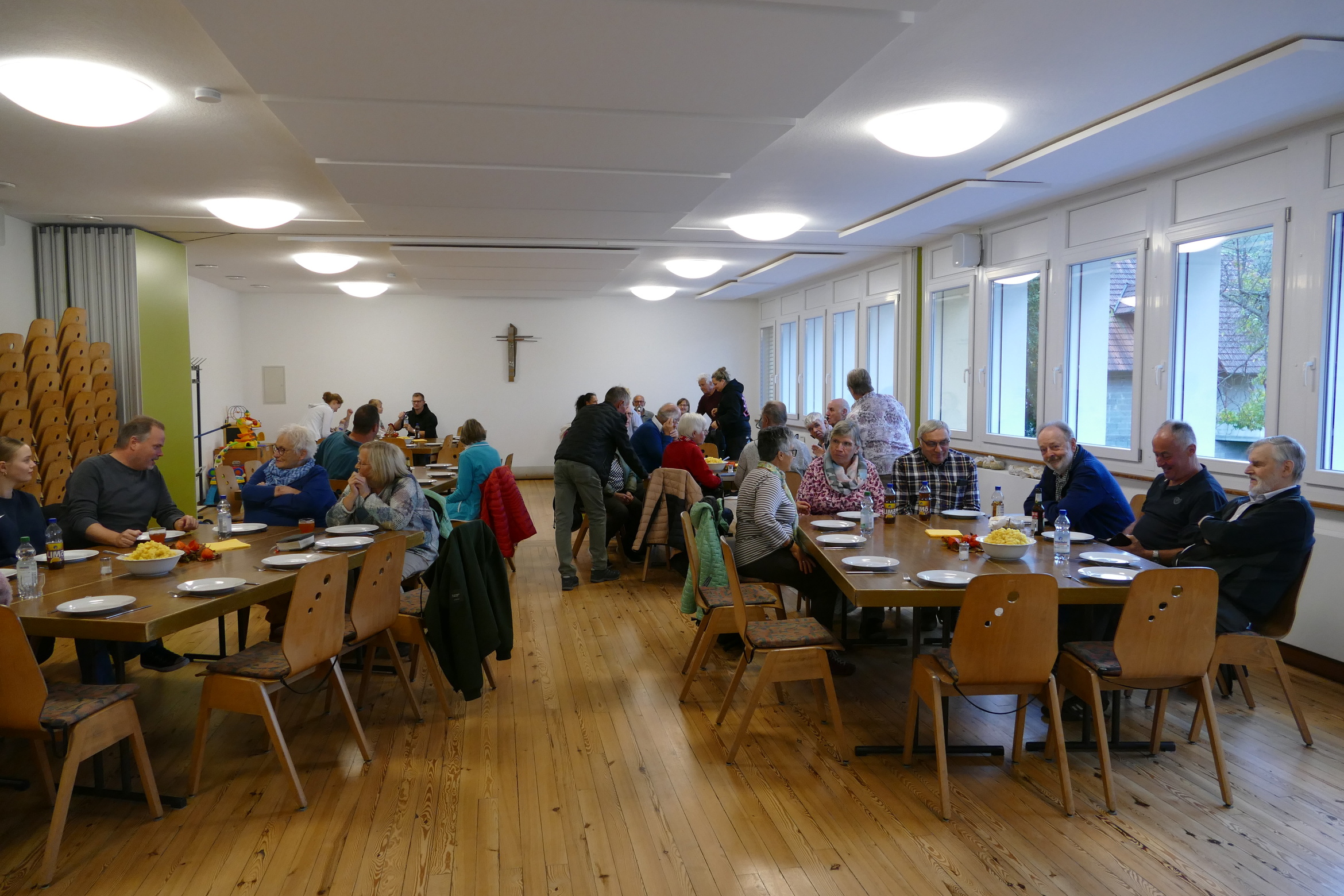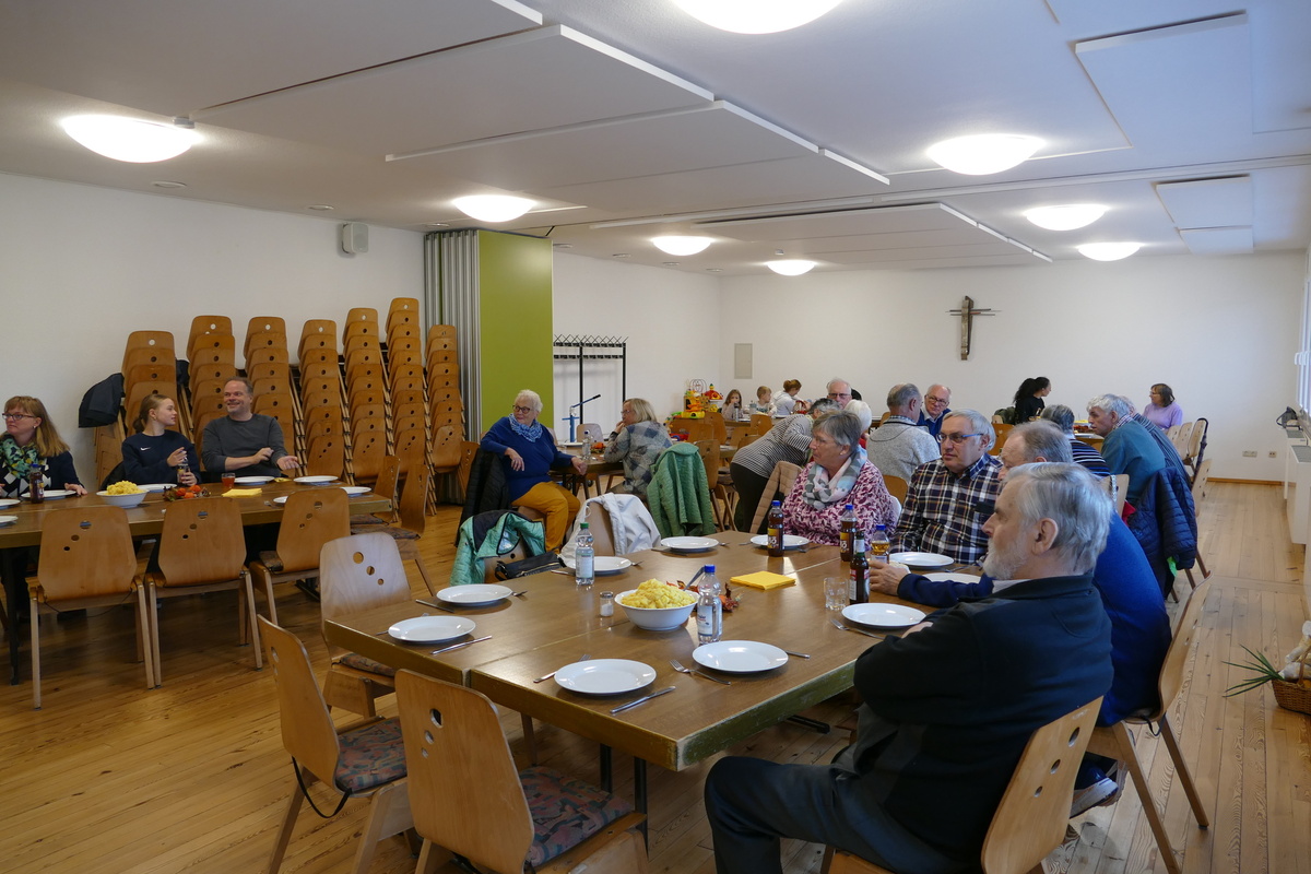 Im Anschluss waren alle zum gemeinsamen Mittagessen ins Pfarrheim eingeladen, wo der Pfarrgemeinderat mit einigen Helferinnen und Helfern Leberkäse, Kartoffelsalat und Eier vorbereitet hatte.