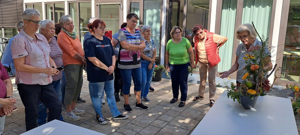 Am Nachmittag setzten die Teilnehmerinnen das Gelernte praktisch um. Mit viel Geschick entstanden kunstvolle Blumengestecke, die das Thema Erntedank in seiner Vielfalt widerspiegelten – von Sonnenblumen und Lampionblumen über Früchte und Fruchtstände bis hin zu herbstlich verwelkten Blättern. Zum Abschluss wurden die Werke gemeinsam betrachtet und besprochen. Frau Höchemer gab hilfreiche Tipps, wie z.B. durch reduzierte Gestaltung, räumliche Tiefe oder die bewusste Wiederholung von Farben die Wirkung verstärkt werden kann.