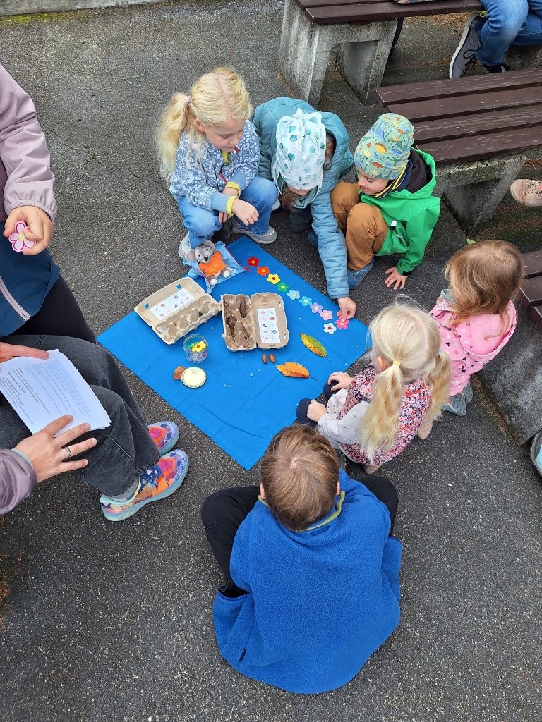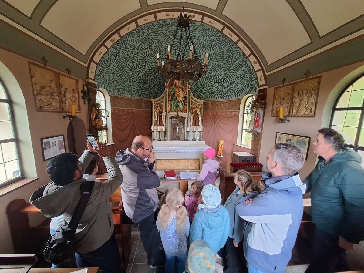 Unser Ziel war die Waldkapelle im Steinbachtal, in deren Inneren wir die Heilige Theresa und das Christkind bestaunten. Dann hörten wir in einer kleinen Andacht die Geschichte von Frederik. Wir erfuhren, dass er ganz andere Vorräte gesammelt hat, um die langen, kalten Wintertage zu überstehen: Sonnenstrahlen, Farben und Worte. Alle Kinder durften diese Dinge selbst spüren, sehen und hören.