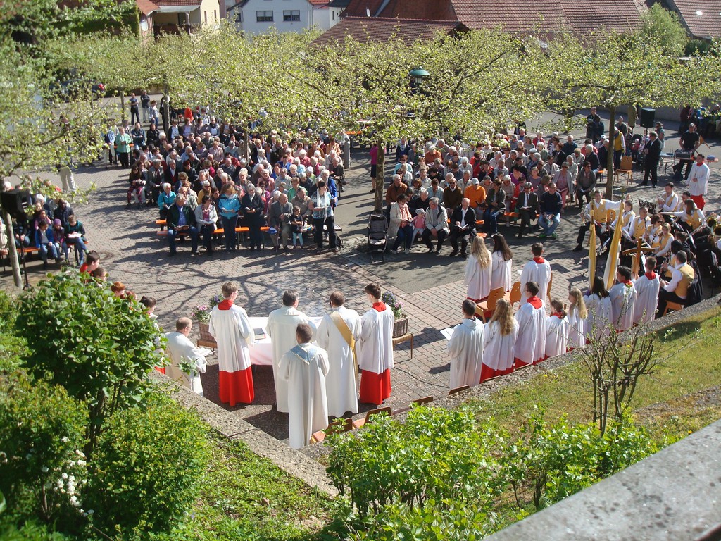 Anschauliche Beispiele waren auf der Prozession von der Kulturhalle bis zum Löwenparkplatz nicht nur die aufblühende Natur, sondern auch der Gedenkstein für die deutsch-französische Städtepartnerschaft nach dem Dunkel des Krieges, der renaturierte Amorbach, dessen Wasser munter sprudelnd über die Steine fließt und ein Rohbau, als Sinnbild für Wohnraumschaffung und Integration von Flüchtlingen.