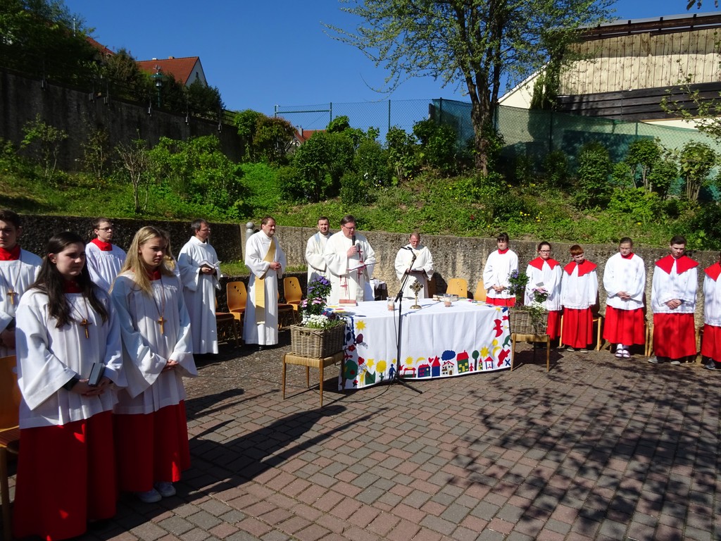 In einer gemeinsamen Predigt von Pfarrer Jarosch, Pfarrvikar Kowalski, den Diakonen Höfer und Seibert, sowie dem Pastoralreferenten Riebel wurde das Thema „Abschied“ von verschiedenen Seiten beleuchtet, mit persönlichen Erlebnissen bereichert und in Verbindung mit der Himmelfahrt Jesu und den neuen Anforderungen der Pastoral gebracht. Abschied hat immer zwei Seiten: Schmerz und Freude. Auch die Kirche hat sich im Laufe ihrer Geschichte immer wieder schmerzhaft von festgefahrenen Glaubenssätzen verabschiedet, aber dafür neue Chancen eröffnet. Das 2. Vatikanische Konzil ist ein gutes Beispiel dafür. Statt der reinen Orientierung auf den Priester haben Laien als Getaufte und Gefirmte die Glaubensweitergabe und die Arbeit in der Gemeinde in die Hand genommen. Das war und ist nicht immer einfach.