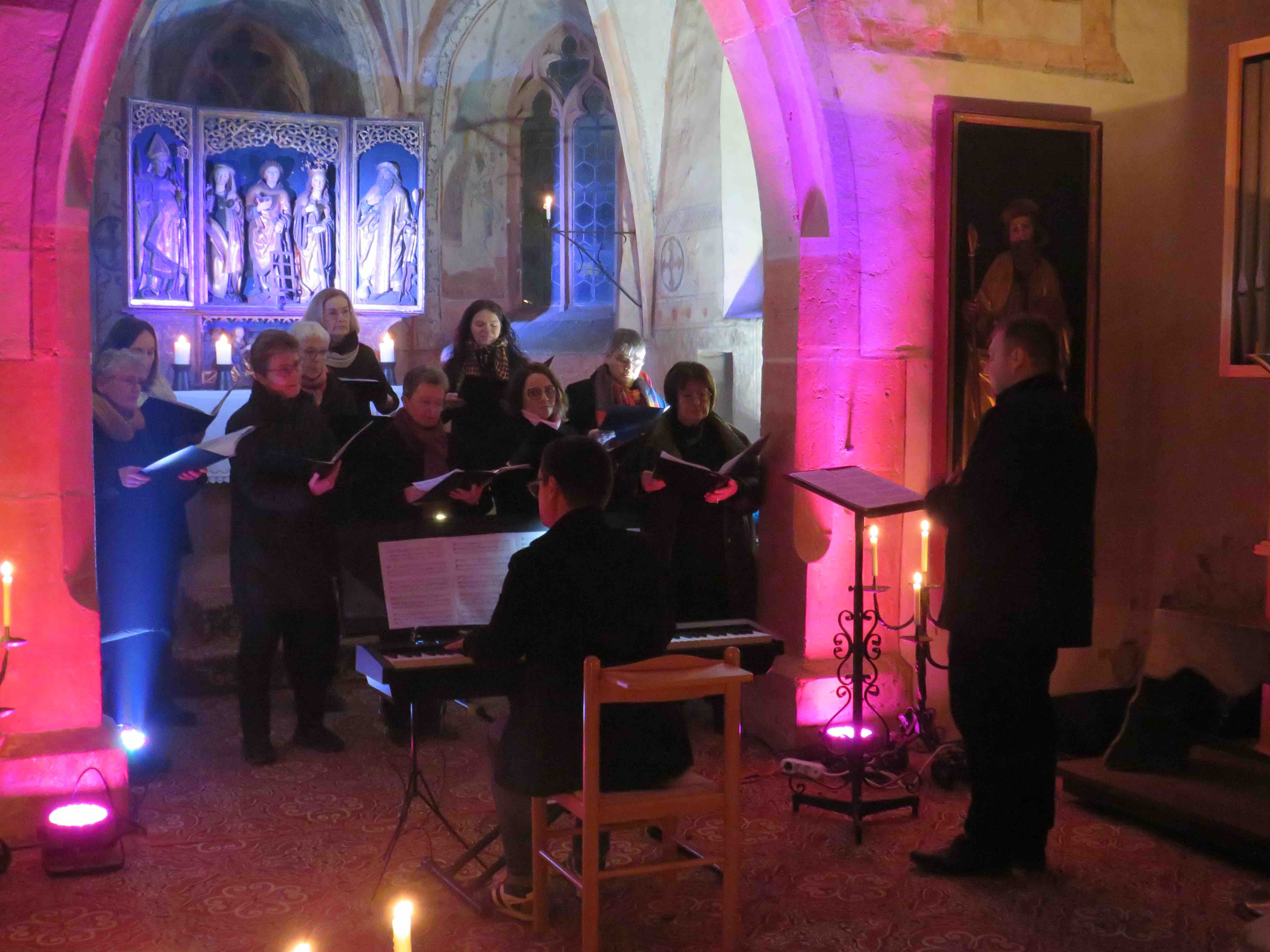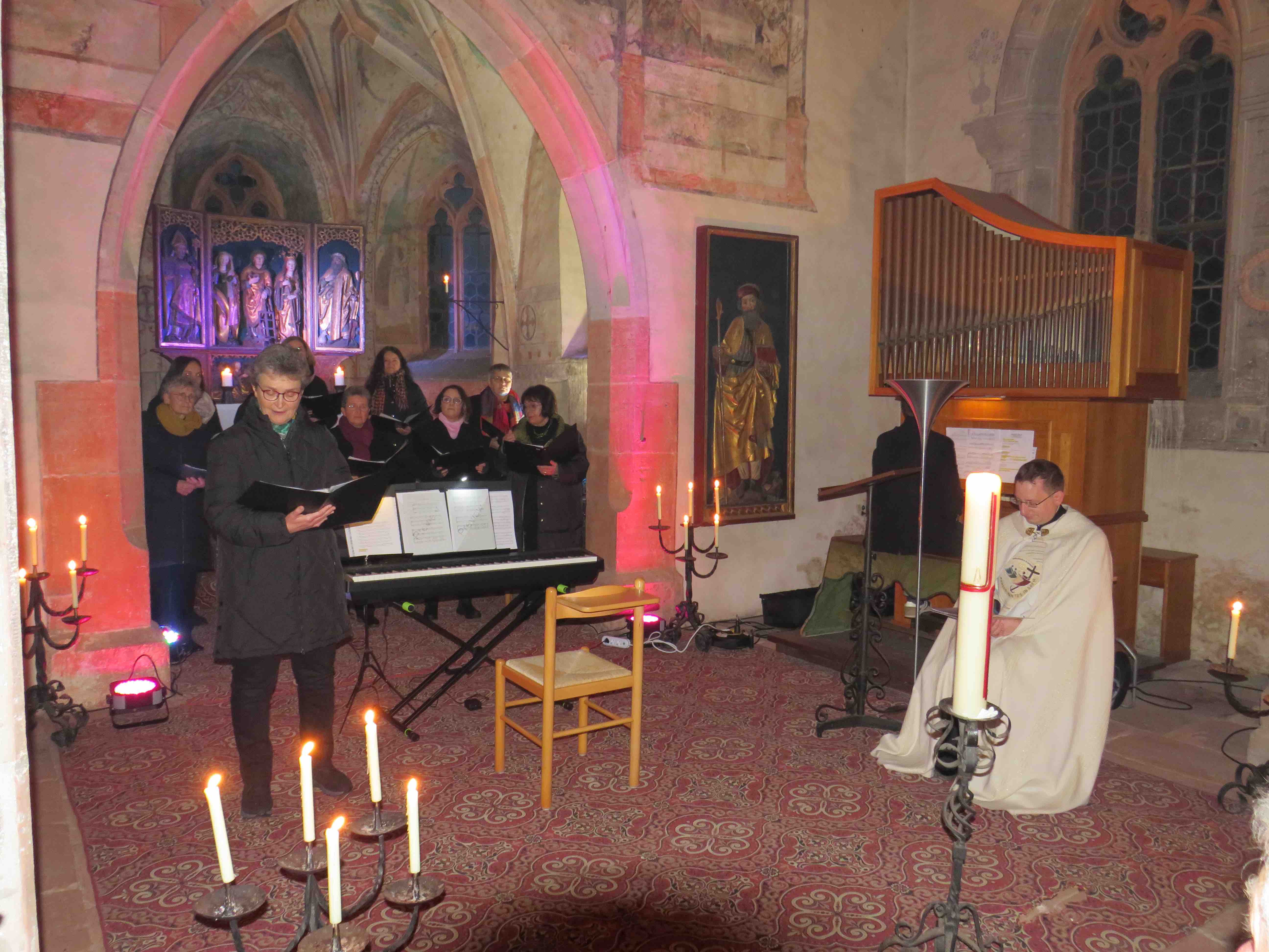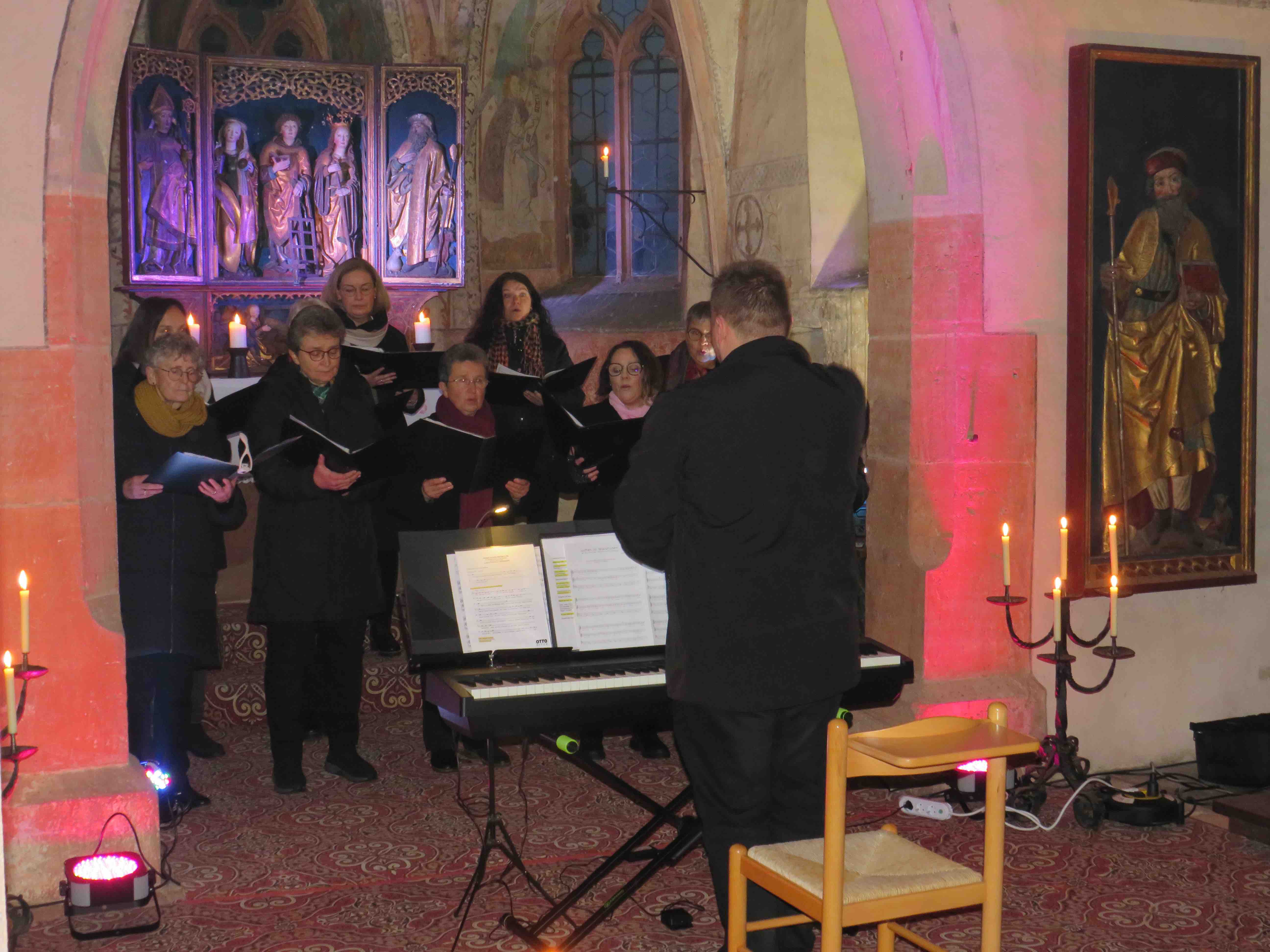 Die Sängerinnen freuten sich sehr, dass Michael Bailer heute da sei und die Andacht mit seinem Orgelspiel bereichere. Gute Dirigenten seien enorm wichtig für einen Chor, dabei müsse neben dem fachlichen Können auch Freude und Motivation überspringen und dieses Glück habe man bisher immer gehabt.