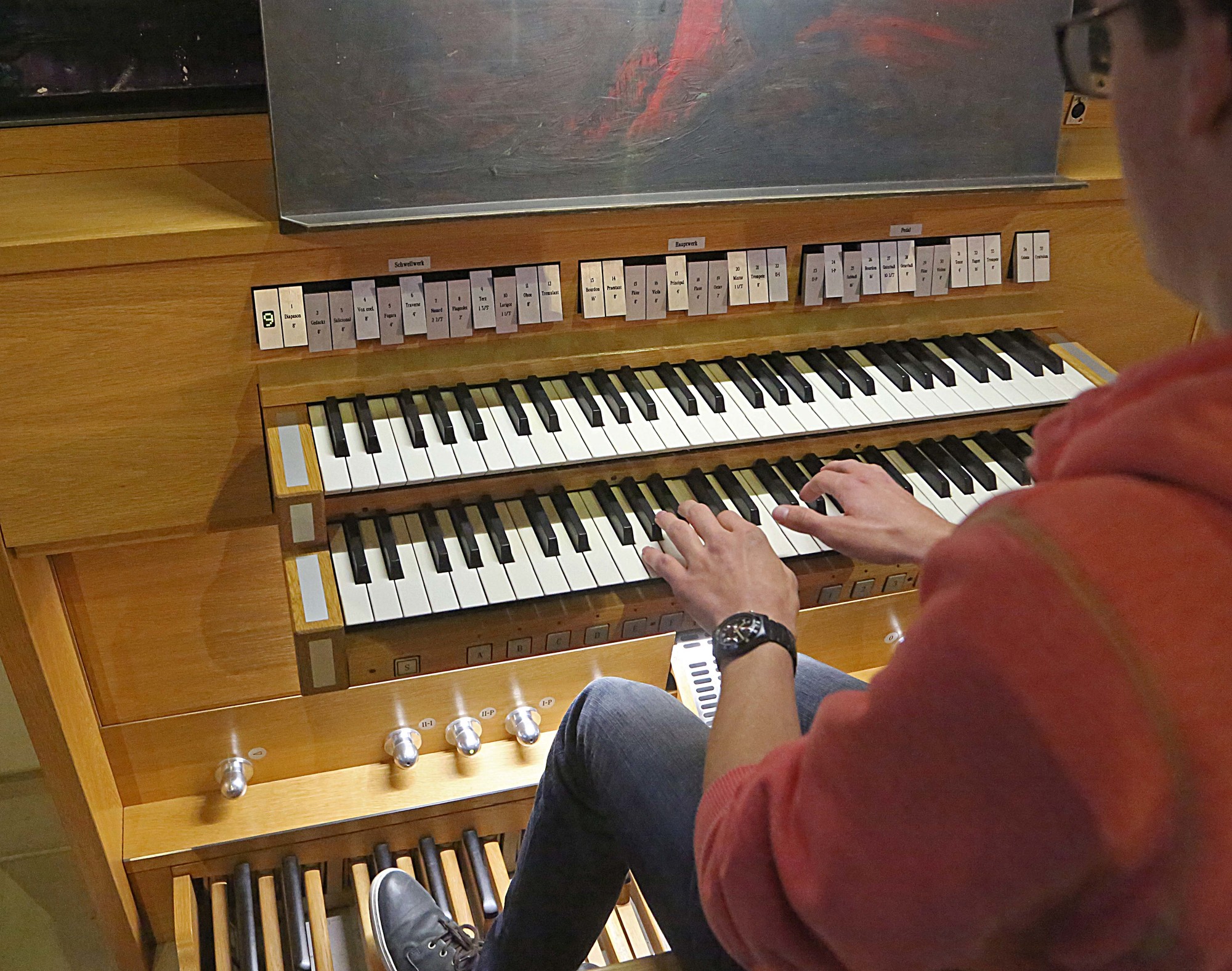Im Grunde genommen sei das Orgelspielen ein Handwerk, eine Technik. „Man braucht zu 100 Prozent das technische Wissen zur Orgel. Wenn das automatisiert ist, ist die Basis für das künstlerische Spielen gesetzt“, sagt Frede. Der Orgelspieler sei also Künstler und Handwerker zugleich. Natürlich brauche man einen gewissen Grad an Musikalität, um neben den Literaturstücken auch improvisieren zu können. „Am liebsten spiele ich Literaturwerke von Bach. Die aber einfach in den Gottesdienst einzubauen, ist immer schwierig, weil man ja nie im Voraus weiß, wie lange etwa die Kommunion dauert“, erklärt Müller. Deshalb werde meist auf ein bestimmtes musikalisches Thema oder ein Motiv improvisiert. „Wenn der Text und die Musik Sinn machen und zum Kontext passen, dann spiele ich gerne auch moderne Stücke.“ Für eine Hochzeit, deren Gottesdienst der junge Organist musikalisch gestaltete, wünschte sich das Brautpaar den Beatles-Song „All You Need Is Love“ – den er natürlich auf der Orgel gespielt habe.