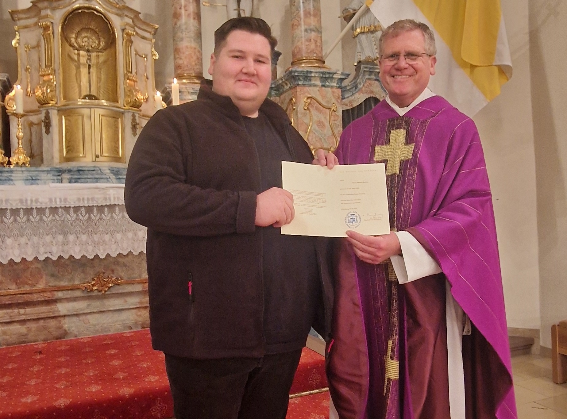 Pfarrer Frank Mathiowetz dankte dem vielfältig engagierten Ehrenamtlichen für seine Bereitschaft diese wichtige und verantwortungsvolle Aufgabe in der Liturgiefeier zu übernehmen und den Gläubigen das Brot des Lebens - Jesus selbst im Altarsakrament - zu spenden als Stärkung für die Pilgerschaft des Lebens. Mit großer Freude überreichte er die Urkunde des Würzburger Bischofs Dr. Franz Jung an Marvin Kerber.