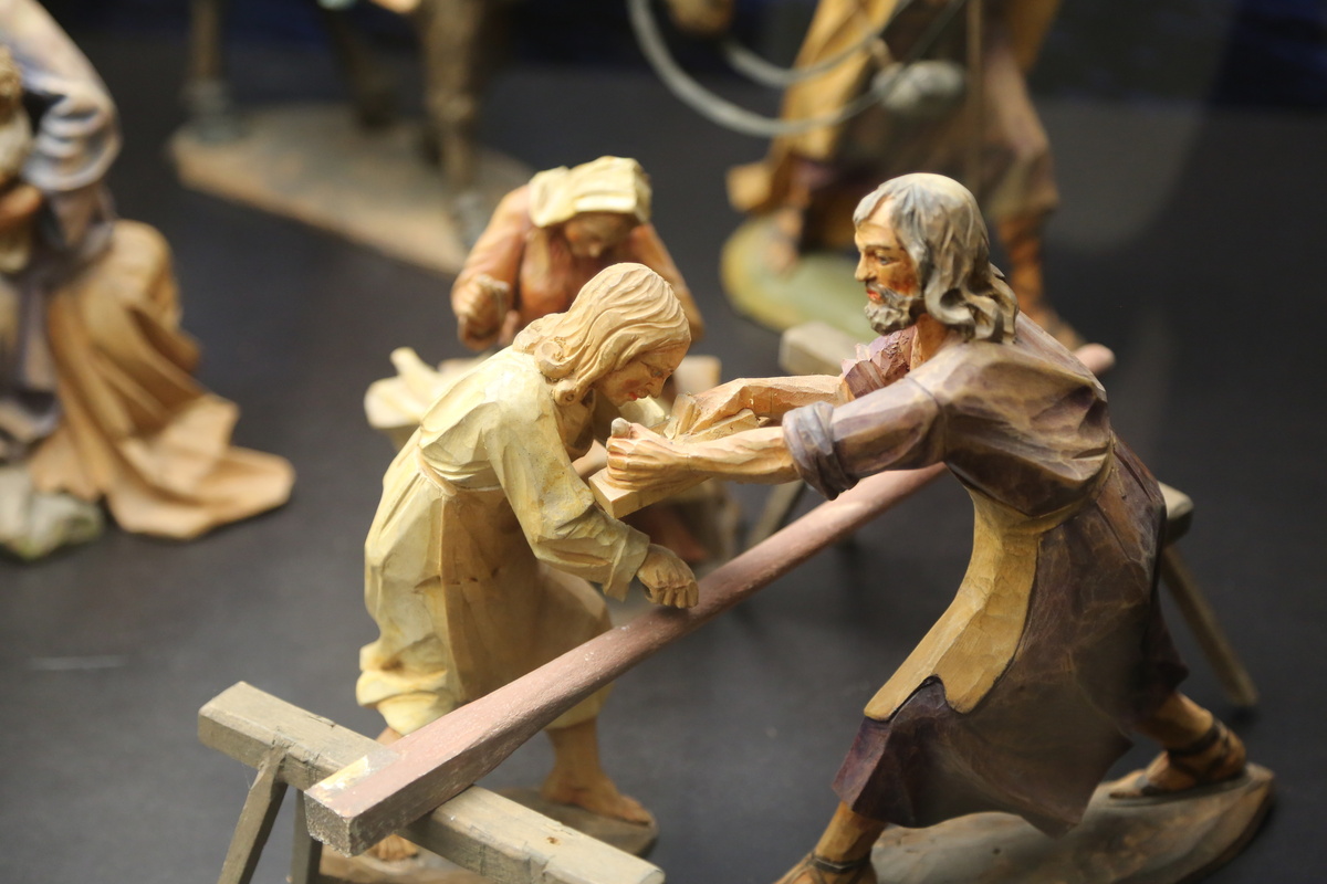 Derbe Hirten, prächtig geputzte Könige, brutale Soldaten und fromme Schriftgelehrte bilden das Personal eines bedeutenden Krippenfigurenensembles. Es stammt aus dem Kapuzinerkloster von Karlstadt und wurde 1998 von der Diözese Würzburg angekauft. „Manche der Figuren haben eine barocke Anmutung, die in das 18. Jahrhundert weist, doch legt die geschichtliche Entwicklung mit ihren starken Zäsuren nahe, dass ein Großteil der Figuren mit Wachs- und Holzköpfen aus dem 19. Jahrhundert stammen muss“, sagte Schneider. Viele der Figuren tragen aufwändige Kleidung mit Stickereien und Bordürenfransen. Eine auffällige Sondergruppe stellen die bärtigen Soldaten in ihren Blechharnischen dar, die in drastischer Weise den Kindermord von Betlehem darstellen. „Diese martialischen Gestalten sind wohl in einer oberbayerischen Werkstatt des frühen 19. Jahrhunderts entstanden.“
