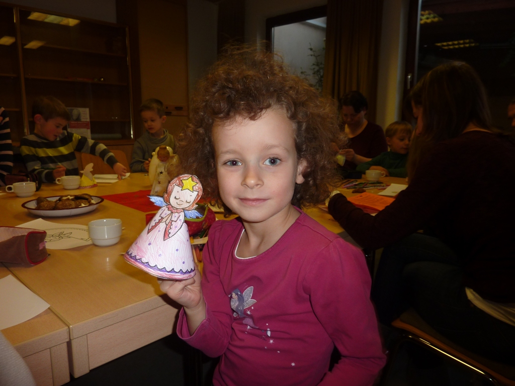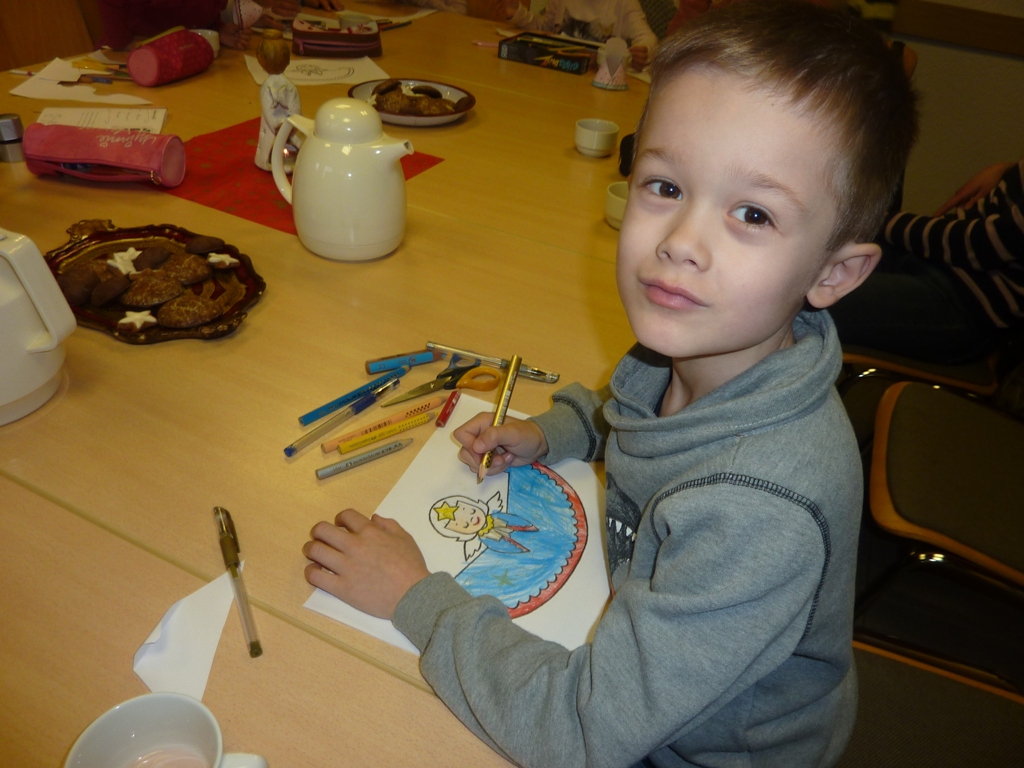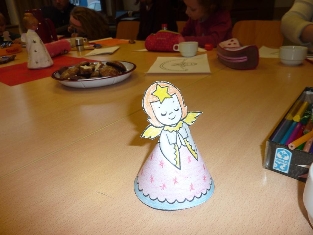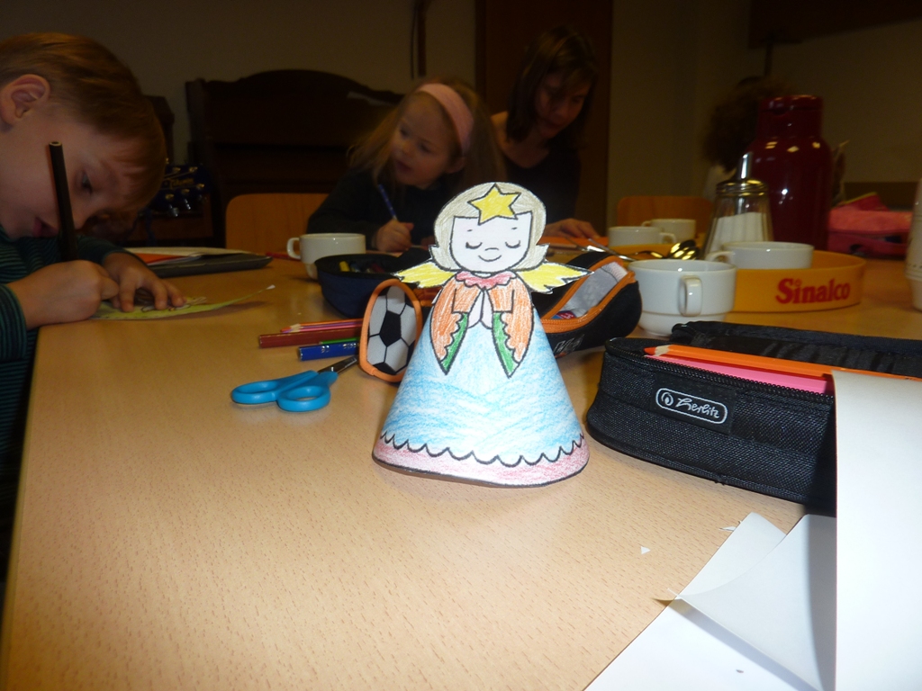 Im Anschluss an die Geschichte bemalten die Kinder verschiedene Engelvorlagen, schnitten sie aus und steckten sie zusammen. So entstand eine wunderschöne bunte Engelparade. Bei Tee und Gebäck sangen die Kinder mit ihren Müttern Weihnachtslieder, die von Herrn Pfarrer Michael Kubatko auf der Gitarre begleitet wurden.