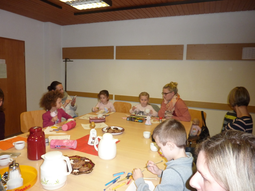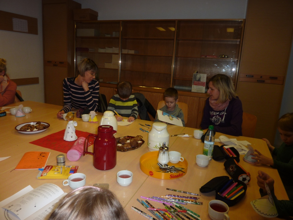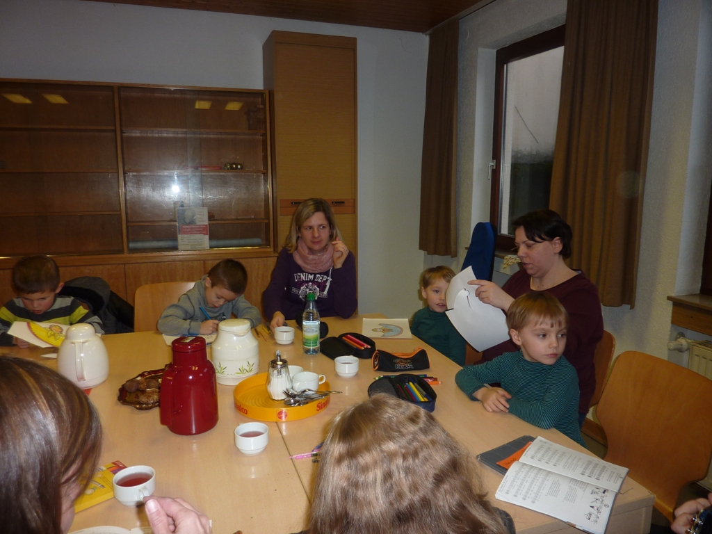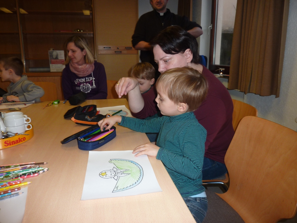 Im Anschluss an die Geschichte bemalten die Kinder verschiedene Engelvorlagen, schnitten sie aus und steckten sie zusammen. So entstand eine wunderschöne bunte Engelparade. Bei Tee und Gebäck sangen die Kinder mit ihren Müttern Weihnachtslieder, die von Herrn Pfarrer Michael Kubatko auf der Gitarre begleitet wurden.