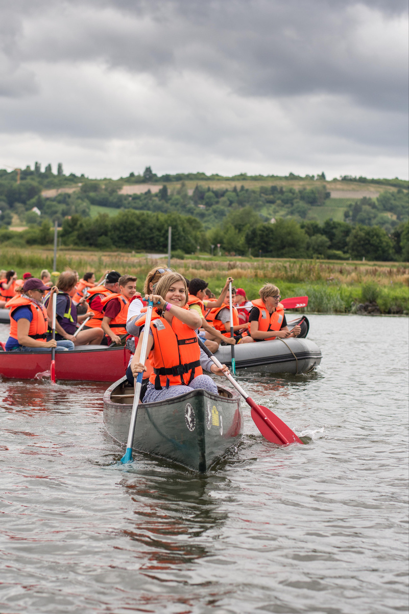 Mehrere Kanadier standen für ca. 40 junge Menschen aus den Regionen Haßberge, Kitzingen und Würzburg in Eibelstadt bereit. Bevor es richtig sportlich wurde, trafen sich alle Paddelbegeisterten zu einer ersten Station in der Eibelstädter Kirche. Das diesjährige Kiliani Wallfahrtsmotto "Nahe ist der Herr allen, die ihn rufen", aus dem Psalm 145, stand auch bei dieser Paddelwallfahrt im Mittelpunkt. Nach einem kleinen Fußmarsch mit anschließender kleinen Stärkung ging es dann auch schon los.
