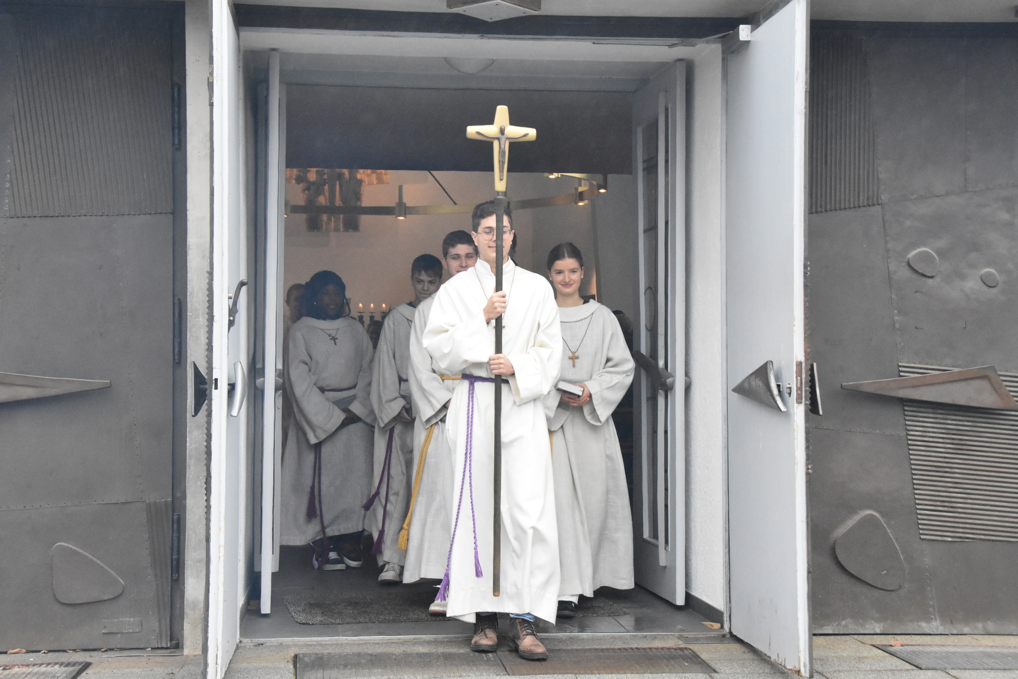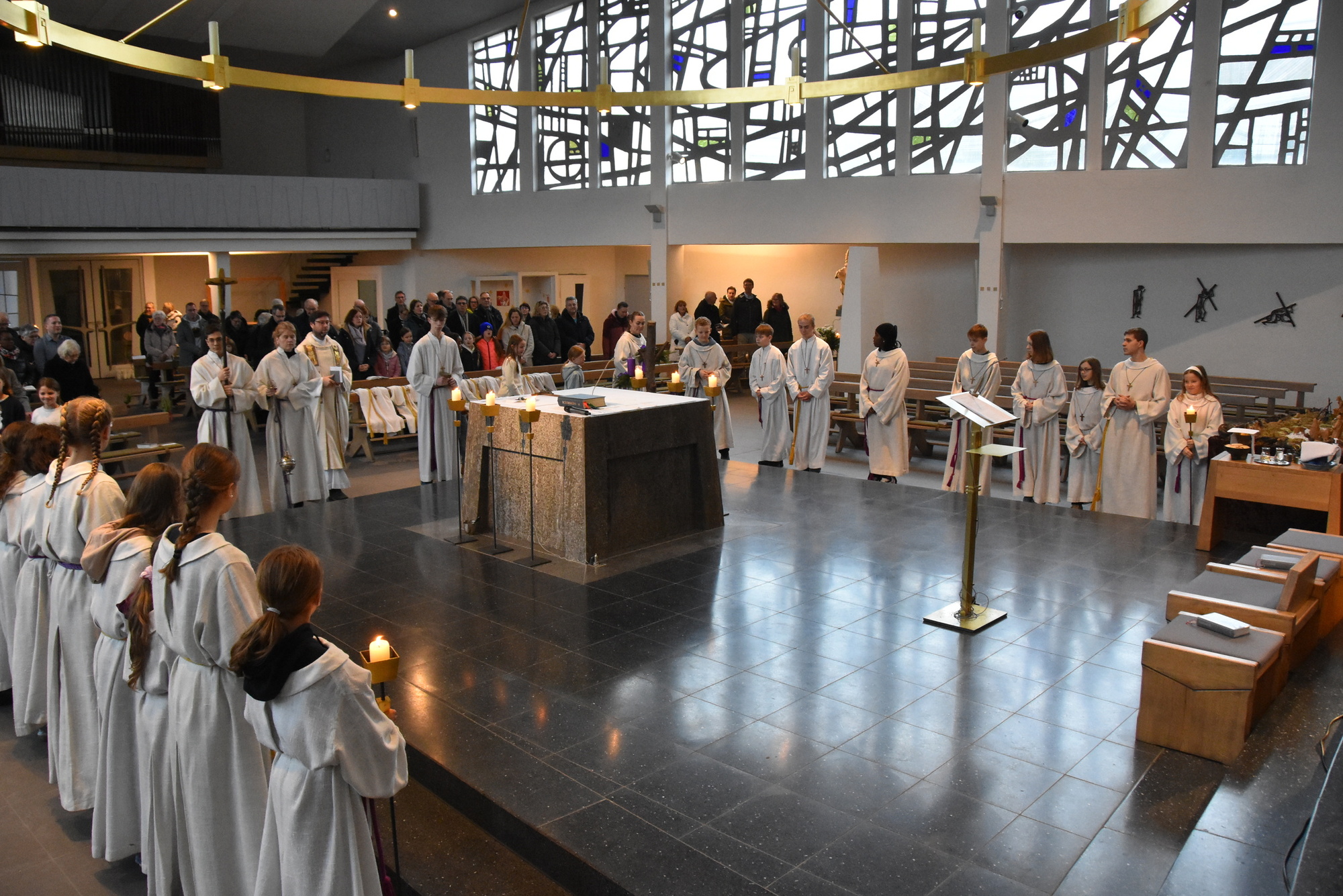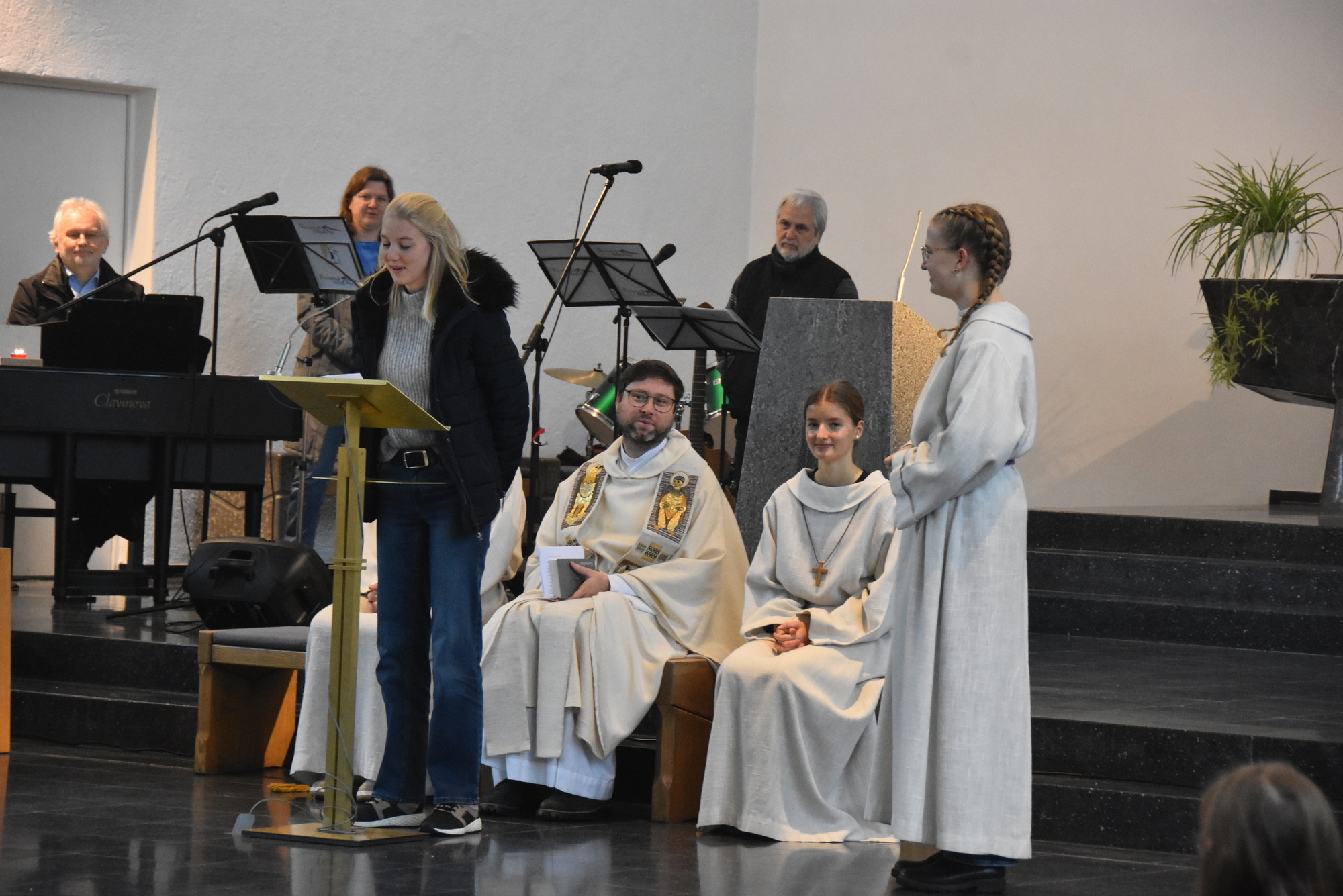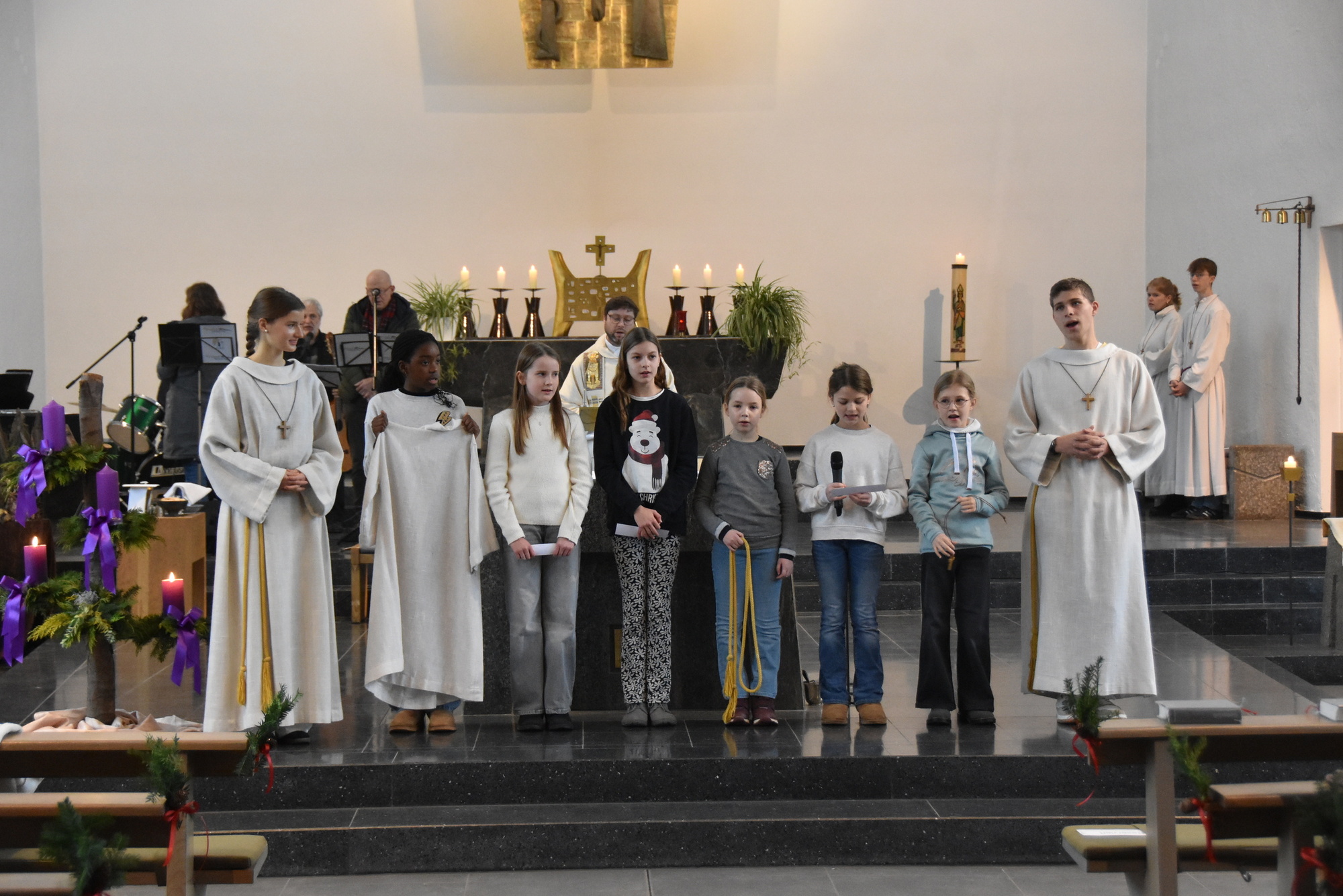 Am Patrozinium am 07.12.2025 war es schließlich soweit: Pfarrvikar Manuel Thomas nahm die sechs Ministrantinnen im Gottesdienst feierlich in die Ministrantengemeinschaft auf. Dabei konnten sie auch ihre Kreativität und ihr Engagement unter Beweis stellen. Nach einer kurzen Vorstellung haben die neuen Minis passend zum Thema des Gottesdienstes ein kleines Theaterstück aufgeführt. Anschließend folgte die festliche Einkleidung der neuen Minis mit Gewand, Kreuz und Zingulum, womit ihre Aufnahme vollständig abgeschlossen war. Schon an der Einführung übernahmen die neuen Minis die Dienste wie Sammeln oder Gabenbereitung.