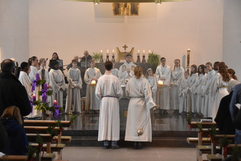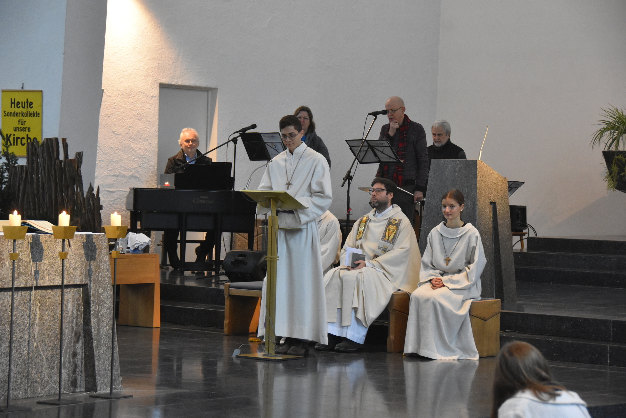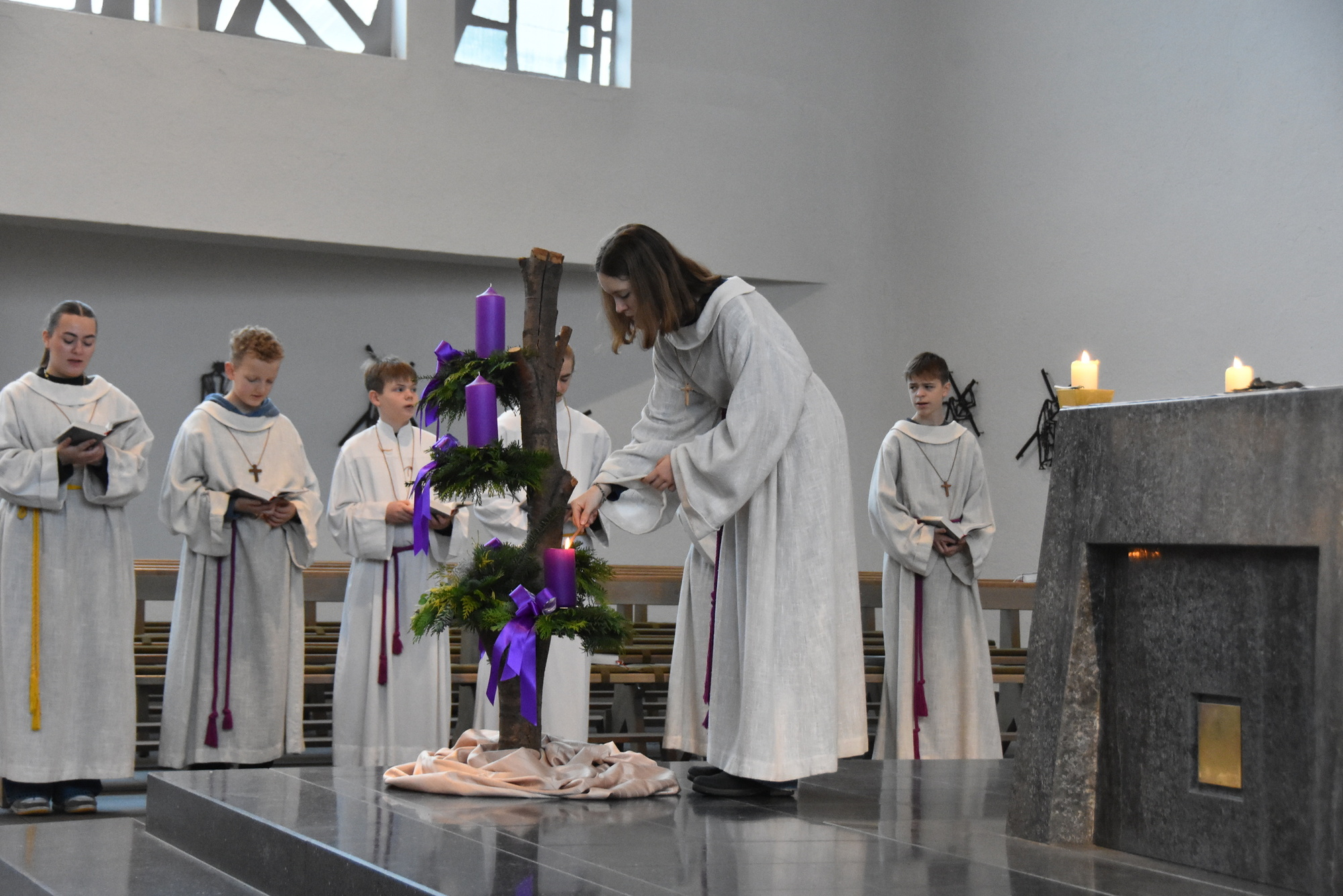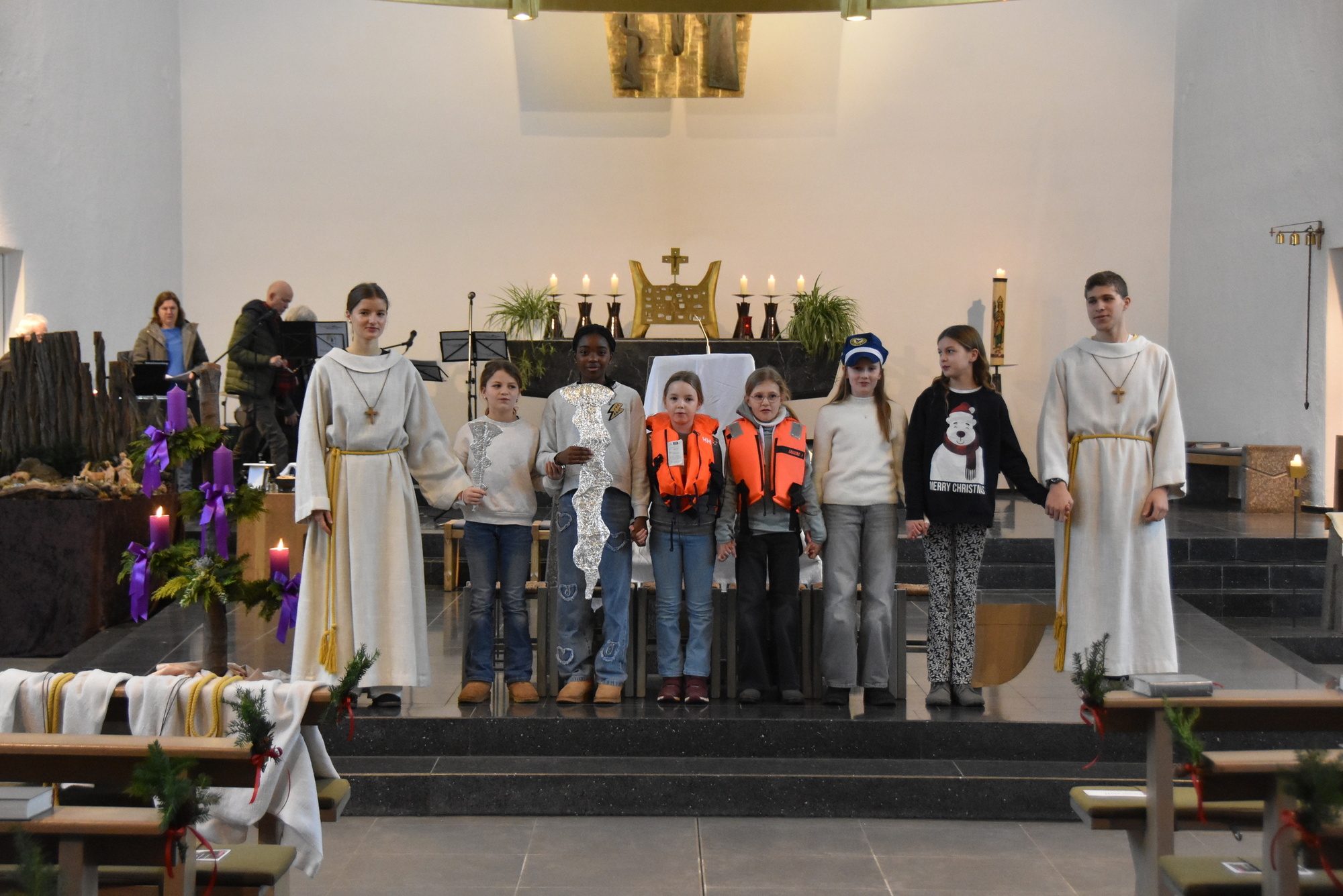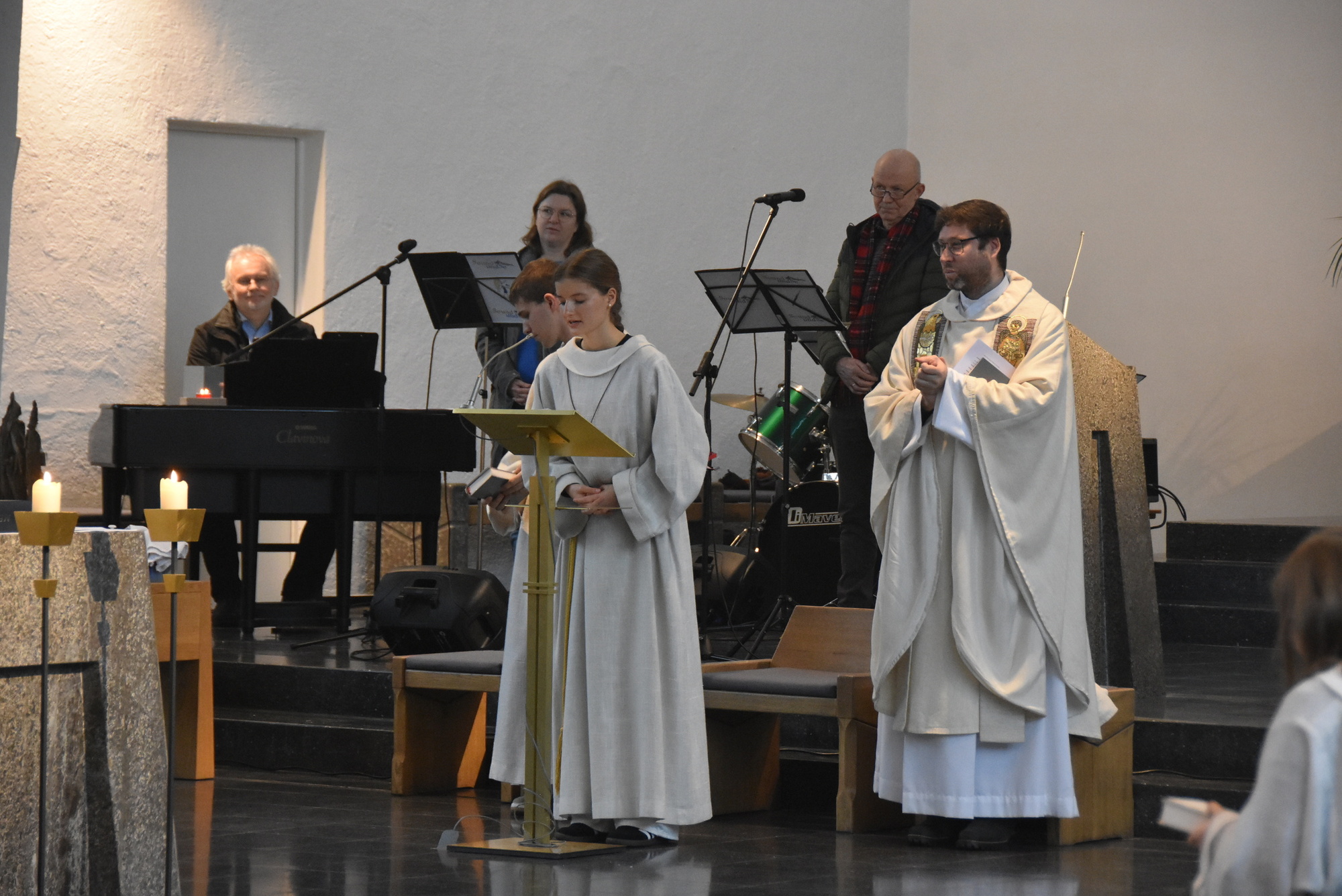 Am Patrozinium am 07.12.2025 war es schließlich soweit: Pfarrvikar Manuel Thomas nahm die sechs Ministrantinnen im Gottesdienst feierlich in die Ministrantengemeinschaft auf. Dabei konnten sie auch ihre Kreativität und ihr Engagement unter Beweis stellen. Nach einer kurzen Vorstellung haben die neuen Minis passend zum Thema des Gottesdienstes ein kleines Theaterstück aufgeführt. Anschließend folgte die festliche Einkleidung der neuen Minis mit Gewand, Kreuz und Zingulum, womit ihre Aufnahme vollständig abgeschlossen war. Schon an der Einführung übernahmen die neuen Minis die Dienste wie Sammeln oder Gabenbereitung.