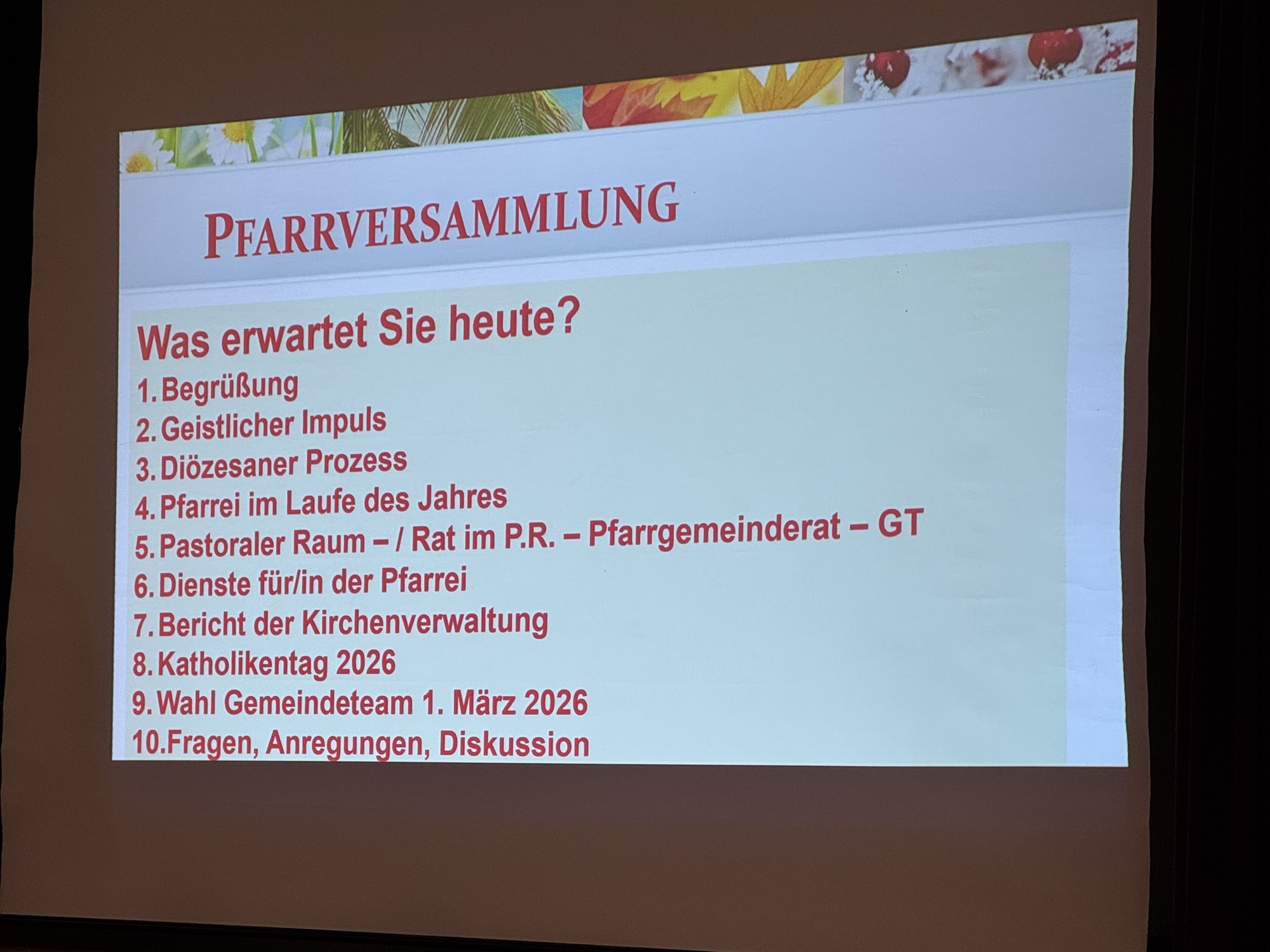 Werner Schmitt ging auch auf die Neuwahl des Gemeindeteams und des PGR ein. Hierfür werden wieder 12 Kandidaten gesucht.