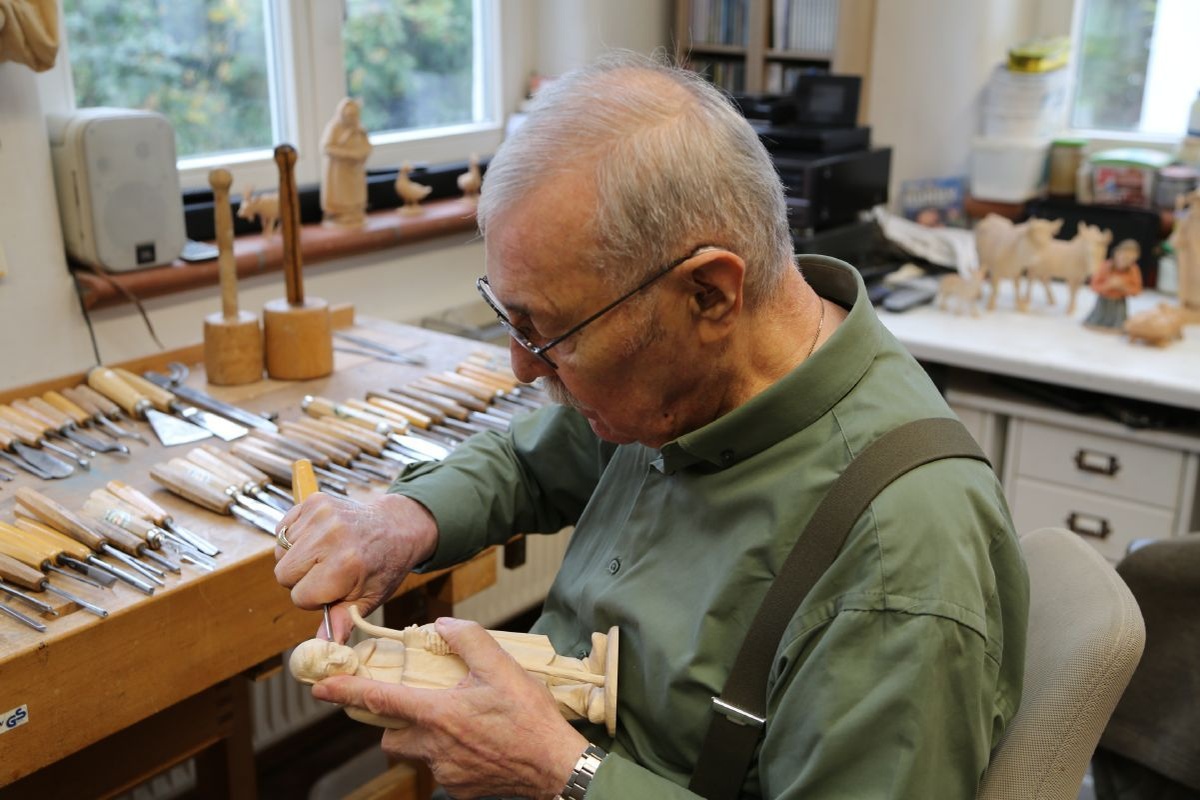 Langenleiten (POW) Der Geruch von Holz und Farbe steigt einem sofort in die Nase, wenn man die Werkstatt von Günter Metz in Langenleiten (Landkreis Rhön-Grabfeld) betritt. Der 82-Jährige betreibt seit über 60 Jahren Handarbeit mit Tradition: die Krippenbaukunst. Er schnitzt Weihnachtskrippen und Heiligenfiguren aus Lindenholz, Kiefer oder Eiche. „Bosnische Linde eignet sich am besten“, sagt er und nimmt einen Schäfer, an dem gerade arbeitet, zur Hand. Er zeigt auf die Unterseite der Holzfigur und erklärt, wie man das Alter des Baumes anhand der Jahresringe ablesen kann. „Die dunklen Ringe stehen für den Winter, die hellen für den Sommer. Zählt man die dunklen Ringe, erhält man das Alter des Baumes.“