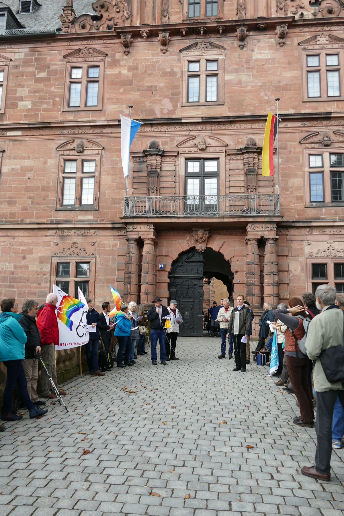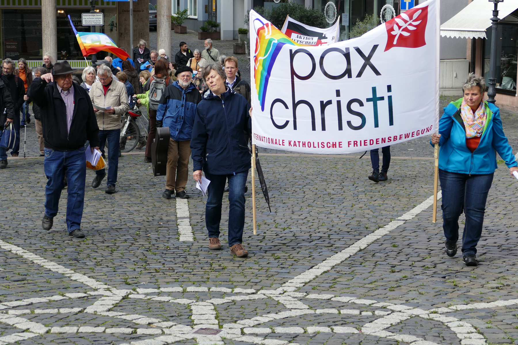 In diesem Jahr war der Rundgang von der Aschaffenburger Gruppe der Friedensbewegung in Kooperation mit den Aschaffenburger Friedenstrommlern vorbereitet worden. Vom Wolfsthalplatz aus, auf dem bis 1938 die jüdische Synagoge stand, ging es auf einen Rundweg durch die Innenstadt zum Schloss Johannesburg, zur evangelischen Christuskirche, zur katholischen Stiftskirche und zum Menschenrechtsdenkmal im Schöntal-Park. Mit Impulsen, Bibellesungen, Gebeten und Liedern griffen die Veranstalter geschichtliche und gegenwärtige Situationen auf, in denen man Frieden und Unfrieden in der Welt entdecken kann. Ein Teil der Strecke verlief auf den geplanten Symbolweg "Ökumene geht", der zwischen der Christuskirche und der Stiftskirche eingerichtet werden soll. Dafür sind in der Steinmetzschule Aschaffenburg zwölf Bronzetafeln geschaffen worden, von denen zwei bereits verlegt sind. Hier erinnerte Bernhard Kullmann, Diakon und Vorsitzender im Diözesanvorstand von pax christi, dass es auch zwischen Konfessionen und Religionen Unfrieden gibt, der überwunden werden muss. "Der Weg, der hier entstehen wird, kann Hoffnung machen", so Kullmann. Weitere Themen waren der Umgang mit Macht und Ohnmacht und die Menschenrechte. Am Ende der Veranstaltung waren die Teilnehmer im Martinushaus noch zu Kaffee und Kuchen eingeladen.