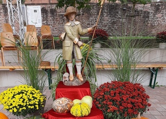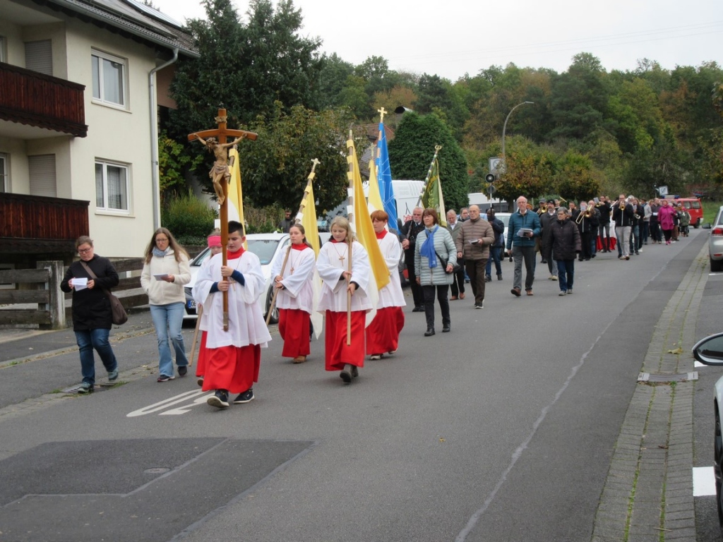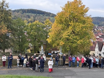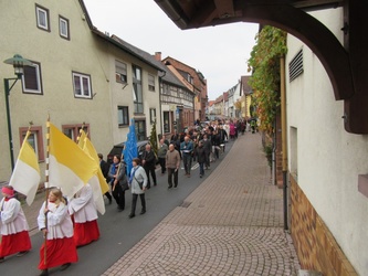 Dabei wird man auch immer dem Hl. Wendelin begegnen, der meistens ein Schaf auf seinem Arm oder zu seinen Füßen hat. Wendelin hat sicher Höhen und Tiefen in seinem Leben erleben müssen. Er war Hirte, Einsiedler und später Abt. Er lebte in und mit der Natur und war auf der Suche nach Gott. Auch für uns hält Jesus viele Gelegenheiten im Leben bereit, der Sehnsucht nach Gott nachzugehen. Unsere Natur, unsere Heimat wie Mömlingen, ist ein Geschenk. Wenn wir unser Leben wenigstens ein bisschen nach seinem Vorbild gestalten, wird unser Leben erfüllt und leicht. Jesus gibt im heutigen Evangelium (Mt 19, 27 ff) auf die Frage von Petrus eine Antwort, was es uns bringt, wenn wir uns auf die Suche nach Gott machen und wie wir beschenkt werden, wenn wir unseren Lebensweg mit Gott gehen.