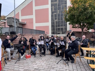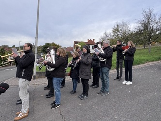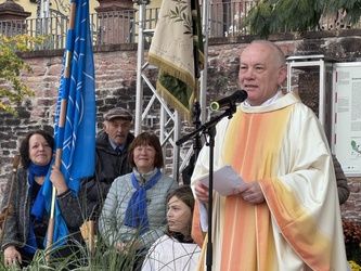 Dieser nutzte die schöne Aussicht auf Mömlingen um auf den Schöpfer hinzuweisen und spendete den Segen mit der Wendelinus-Reliquie. Dann setzte sich die Prozession in Bewegung mit Gebetsanrufungen und Liedern, die vom Musikverein Mömlingen musikalisch unterstützt und durch einige Fahnenabordnungen begleitet wurde. Am Dorfplatz hatten sich schon weitere Gläubige eingefunden, um bei fast frostigen Temperaturen den Gottesdienst gemeinsam zu begehen.